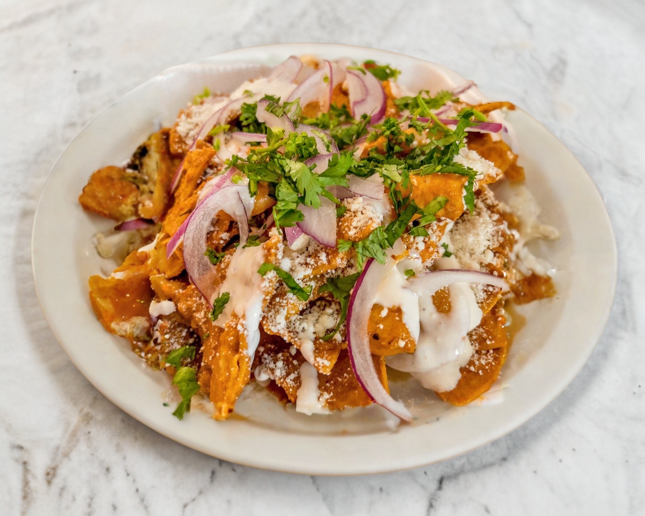 Nuestra versión de chilaquiles pero acompañados de camarón, ¡pruébalos!.