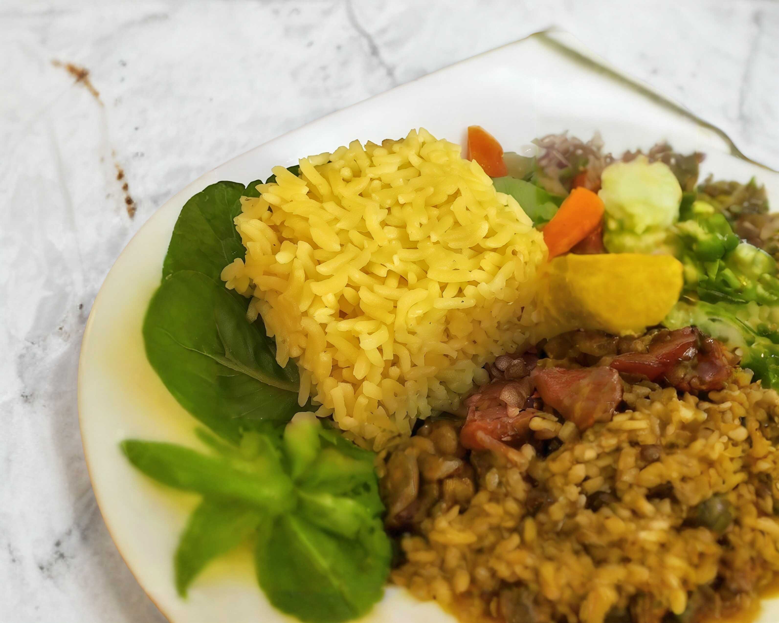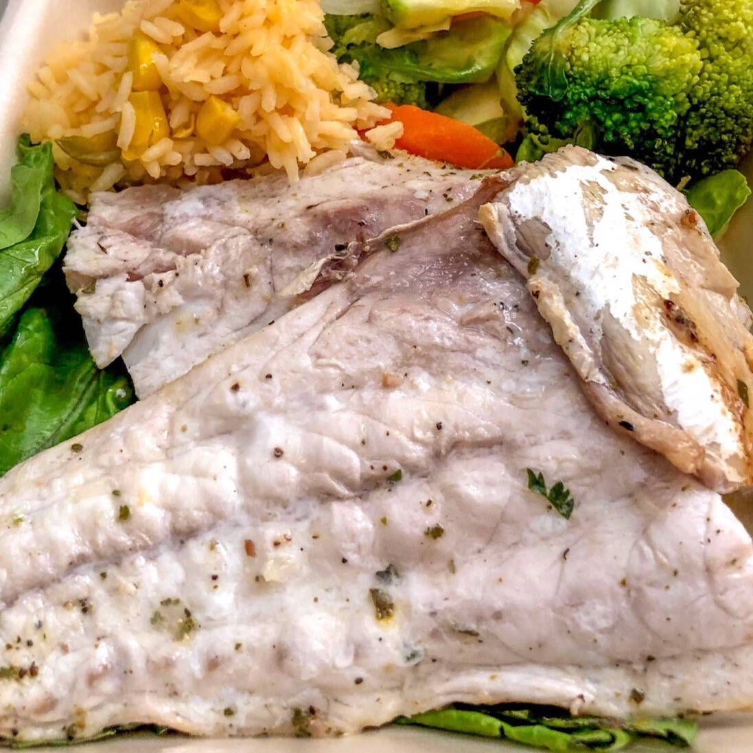 Filete de pescado fresco cocinado a la plancha y acompañado de arroz y verduras.