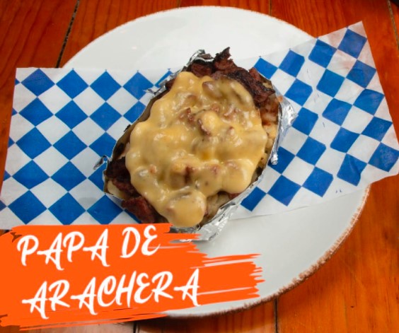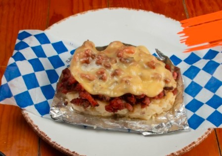 Disfruta de nuestra papa rellena de carne al pastor, acompañada de tocino frito, guacamole y salsa mexicana.