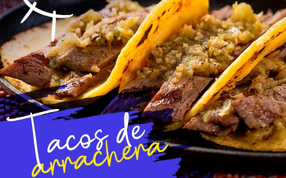 Taquitos de nuestra carne de arrachera tipo angus, sofrito con pimientos y cebolla. Acompañados con tres salsas de la casa.