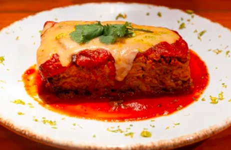 Clásica lasaña Boloñesa con carne de la casa bañada en salsa roja y gratinado con queso.