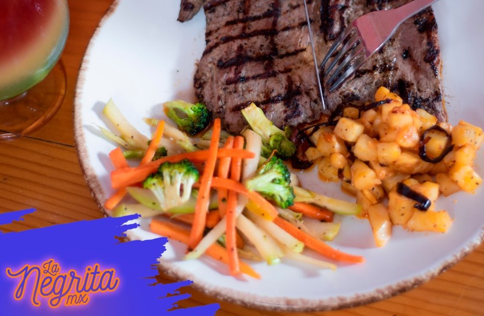 300 gr de carne acompañada de guarnición de papa cremosa y verduras al vapor / o papa rellena y chiles toreados