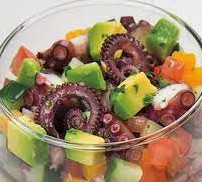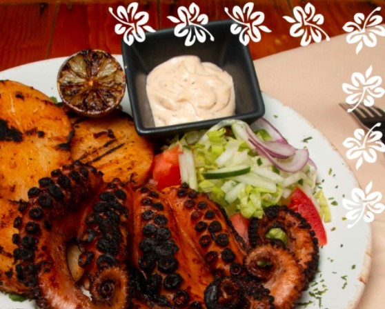 Pulpo estrella a la parilla al punto , acompañada de chiles toreados con cebollines y papas al ajillo con guacamole