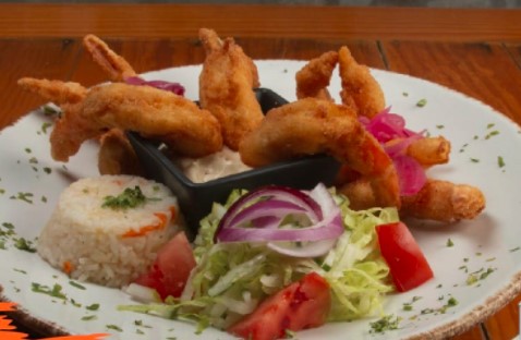 Camarones capeados y empanizados crujientes, acompañados de arroz y verduras frescas.