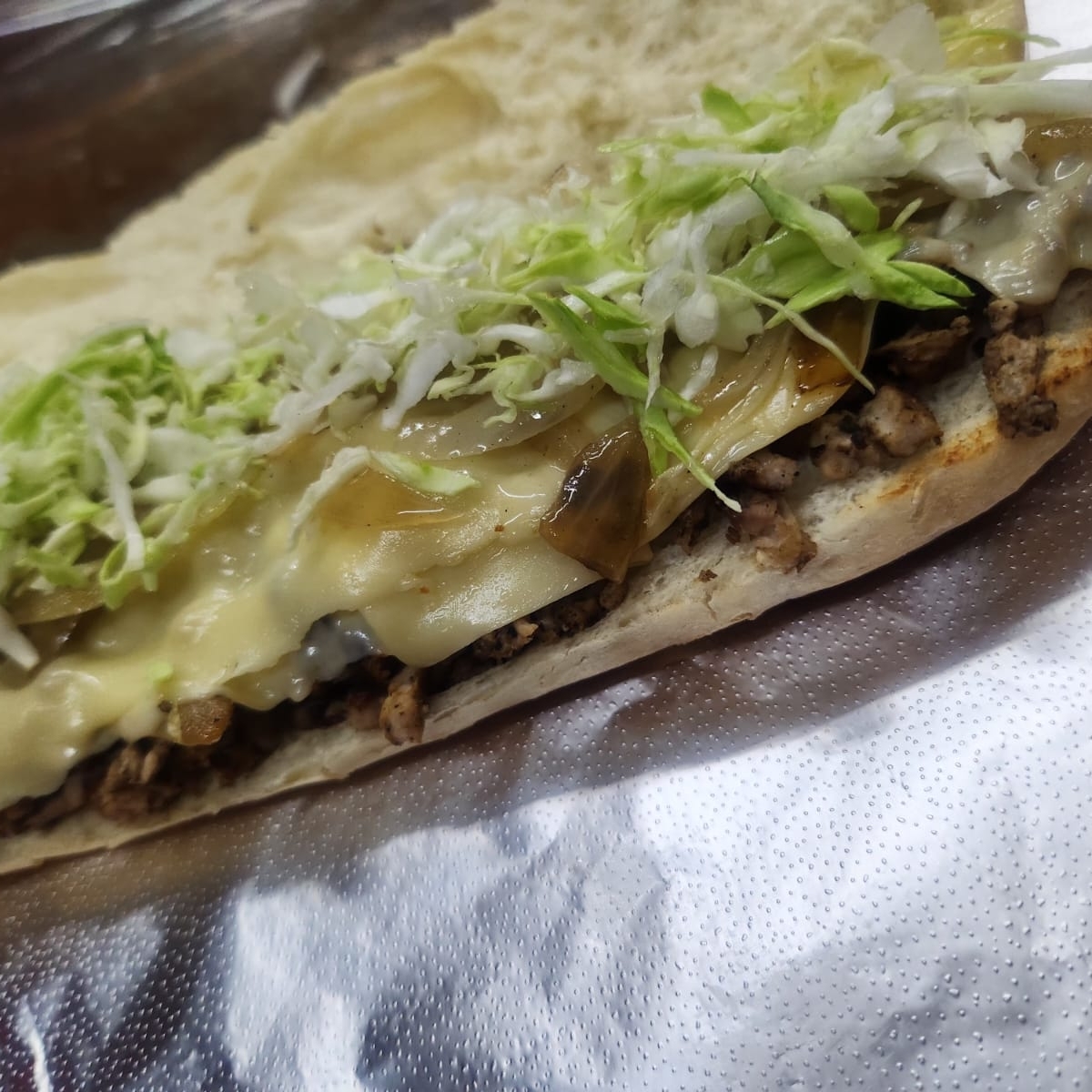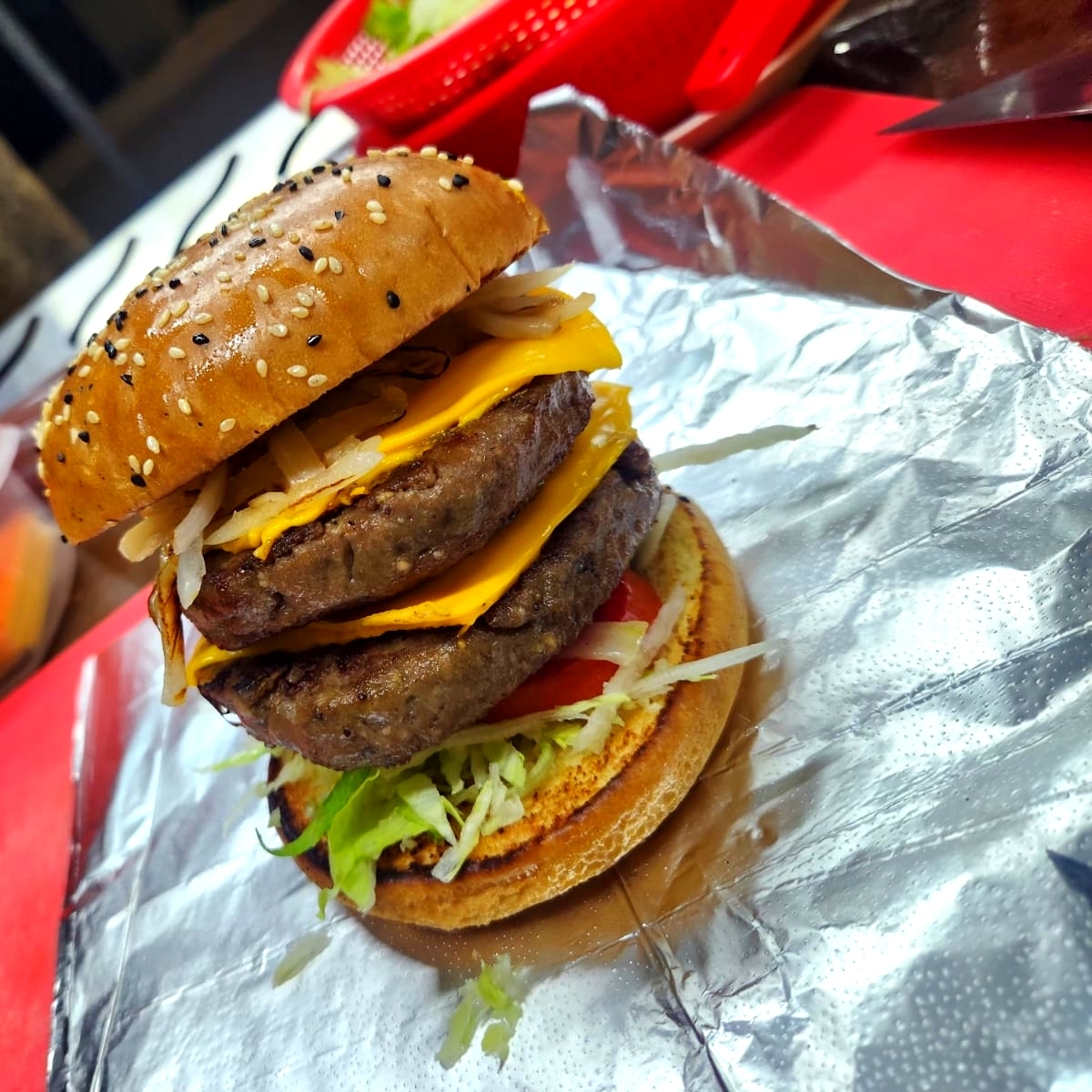 (300 grs de carne, 4 rebanadas de queso americano, cebolla caramelizada rodajas de tomate, romanita, catsup, mayonesa y la porción de papas ala francesa)