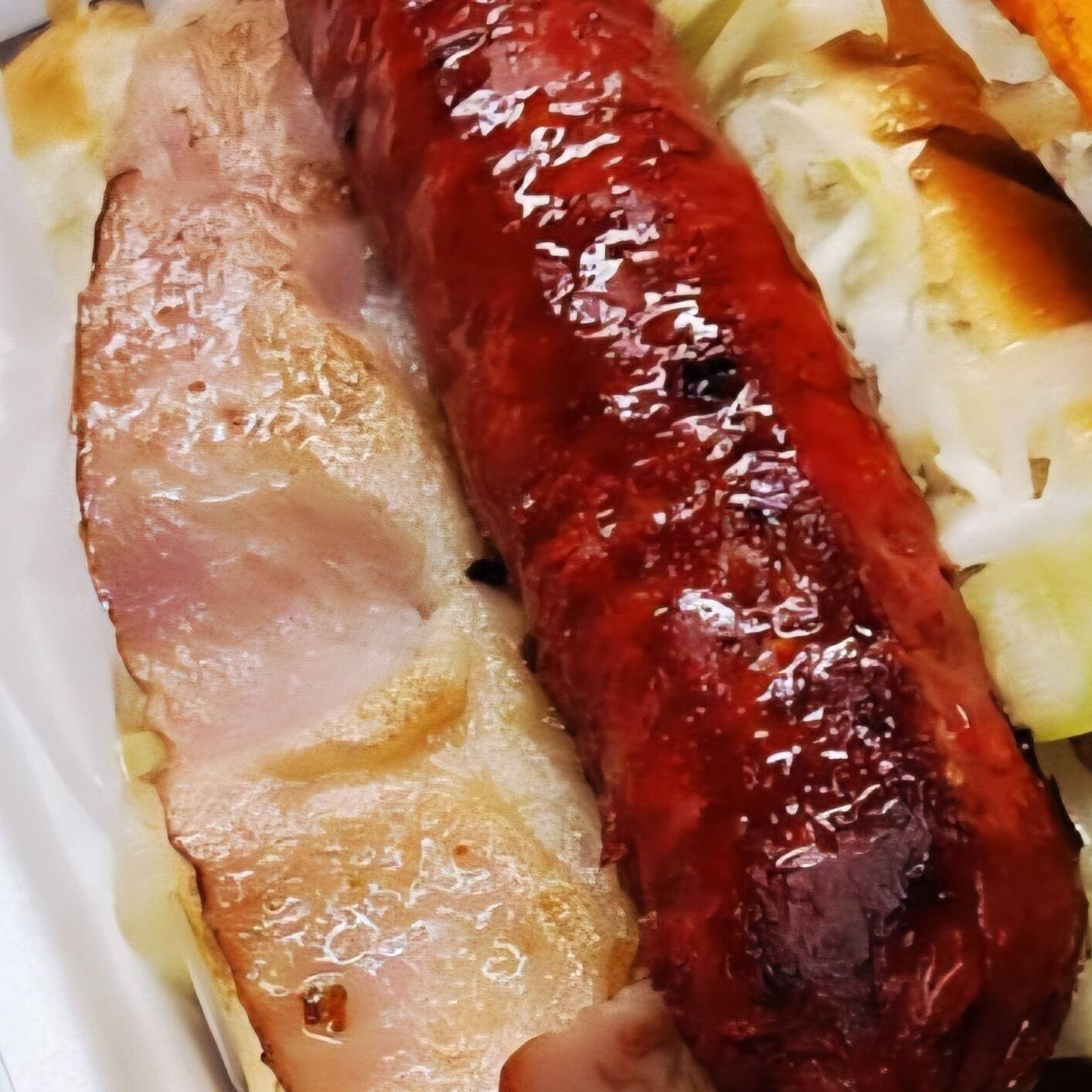 " 150g de jugosa carne premium de Sirloin, coronada con chorizo parrillero, salchicha para asar, tocino crujiente, queso americano fundido y piña asada. Aderezada con mayonesa, catsup, cebolla caramelizada, romanita fresca y rodajas de tomate. Servida con una porción de aros de cebolla."
