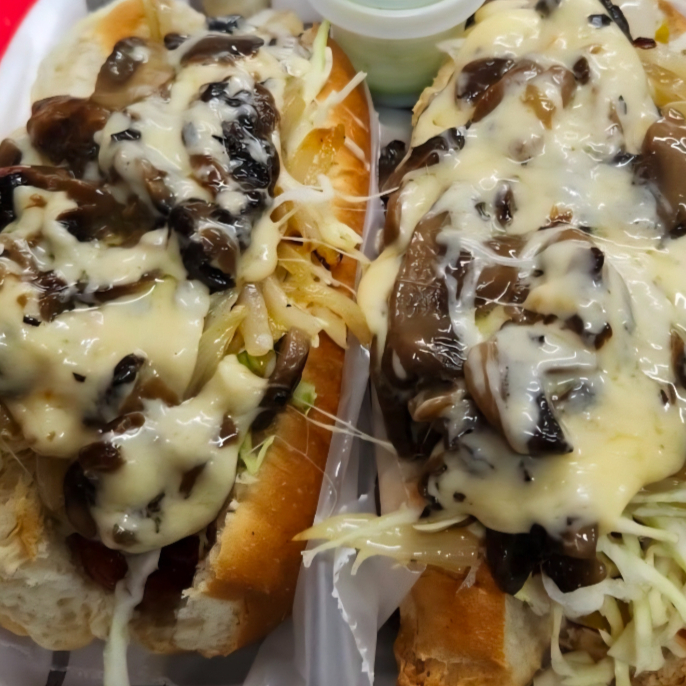 "Exquisito pan artesanal de masa madre relleno de salchicha de pavo, acompañado de champiñones salteados y una generosa capa de queso manchego gratinado ala plancha. Finalizando con el toque clásico de cebolla crujiente, repollo fresco, mayonesa cremosa, mostaza fina y catsup artesanal."