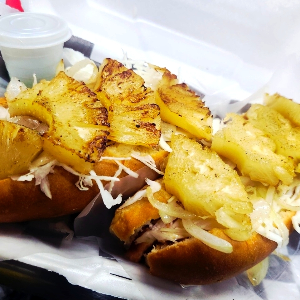 "Exquisito pan artesanal de masa madre relleno de salchicha de pavo, acompañado de una jugosa rebanada de piña . Finalizando con el toque clásico de cebolla crujiente, repollo fresco, mayonesa cremosa, mostaza fina y catsup artesanal."