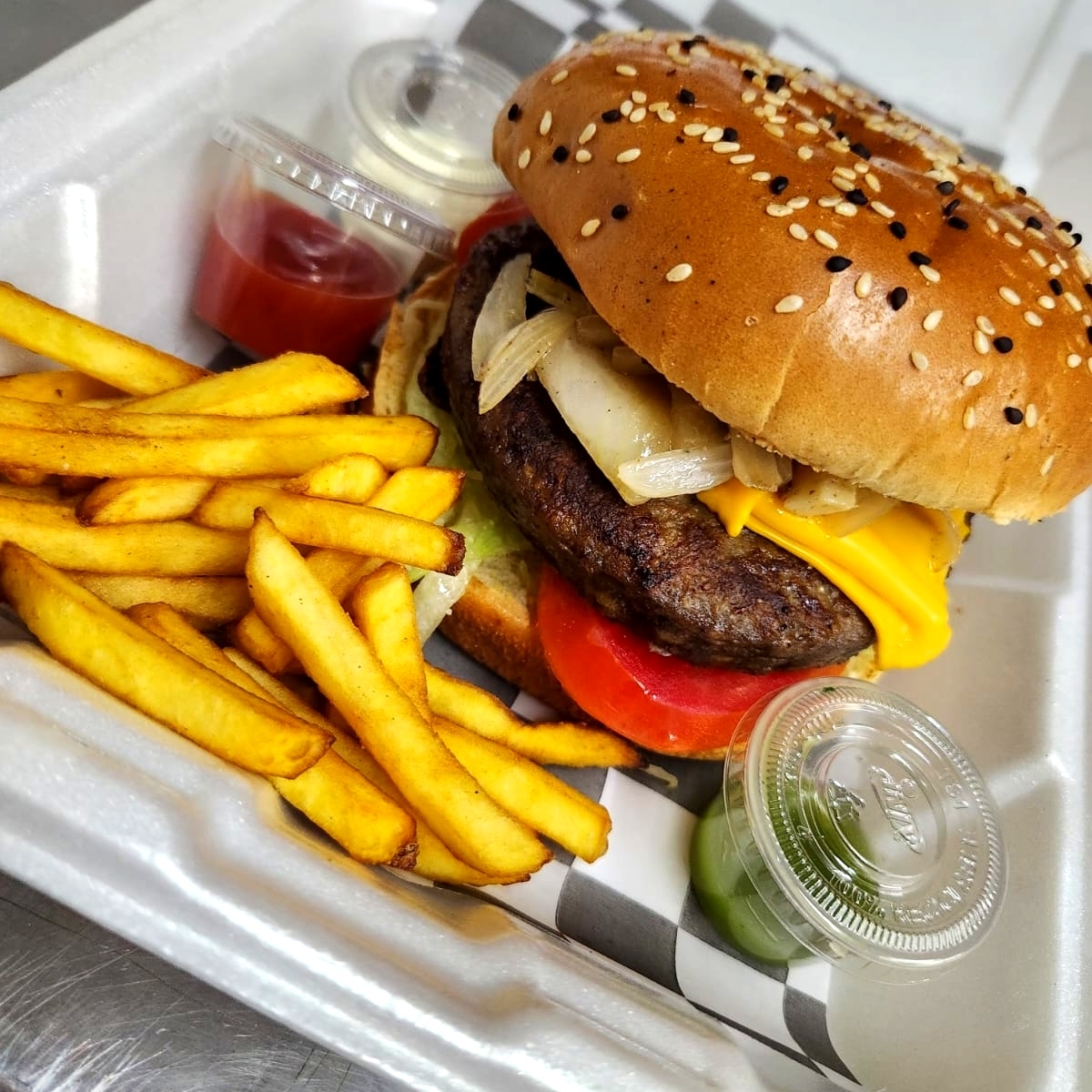 (150 grs de carne, queso americano, cebolla caramelizada, rodajas de tomate, romanita, catsup, mayonesa y la porción de papas ala francesa.)