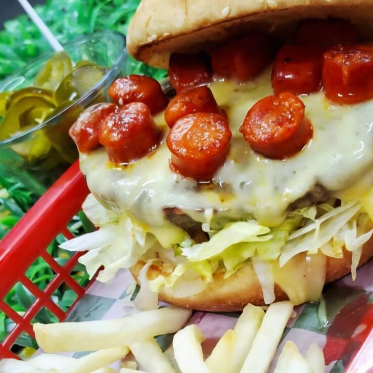 150g. de carne premium de Sirloin, Doble porción de tocino crujiente, Salchicha para asar, Chorizo parrillero, Queso americano fundido, cebolla caramelizada, rodajas de tomate, romanita fresca, aderezada con catsup y mayonesa servida con una porción de papas la francesa