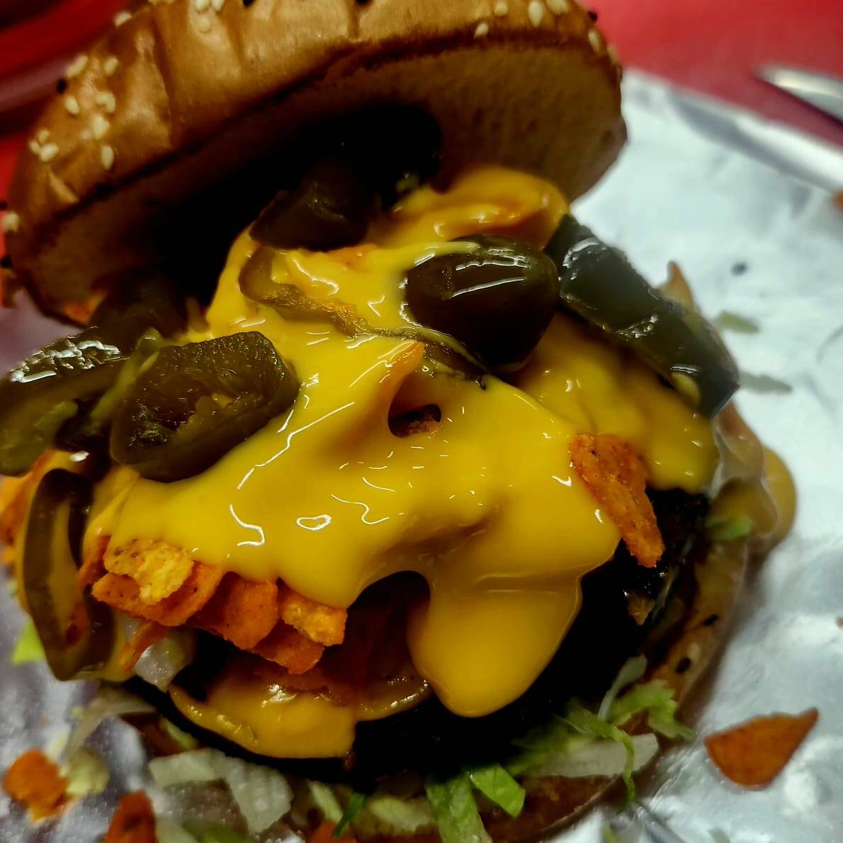 150 gramos de carne premium de Sirloin, fundido en queso americanoro cebolla caramelizada, rodajas de tomate, lechuga romana fresca, acompañado de abundantes Doritos bañados en queso cheddar y rodajas de jalapeños. Todo servido en pan artesanal parrillero aderezado con catsup y mayonesa. Acompañadp de una porcion de papas a la francesa.