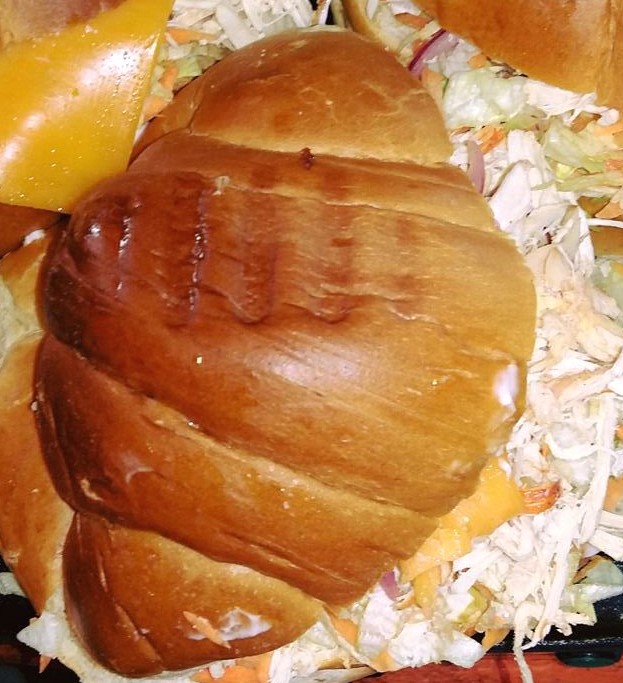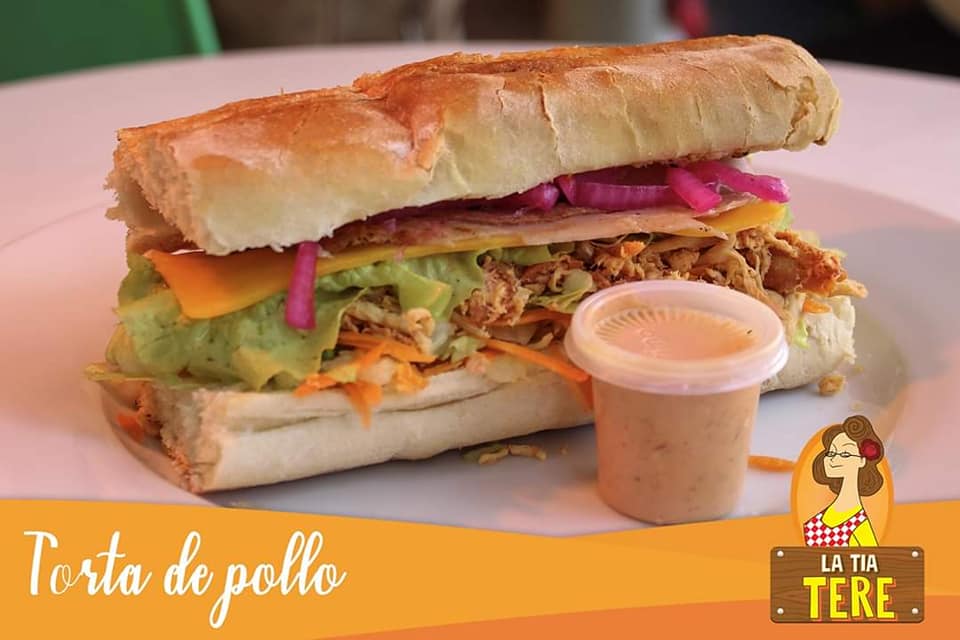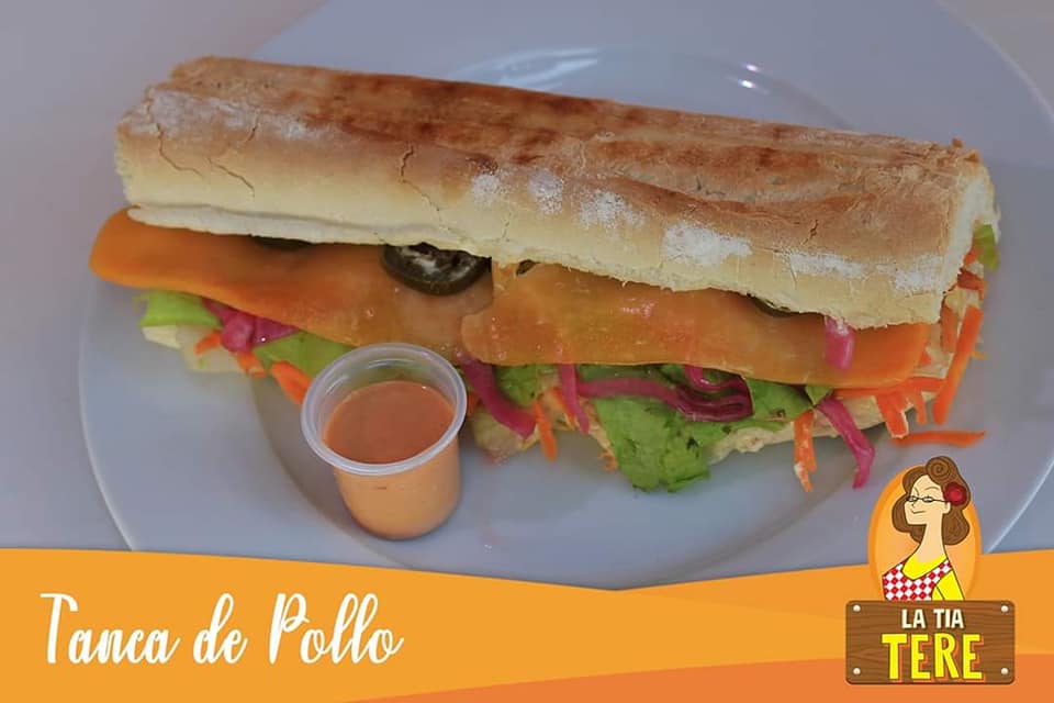 Mayonesa, pollo, queso, cebolla, chile jalapeño, romanita con zanahoria y lechuga.