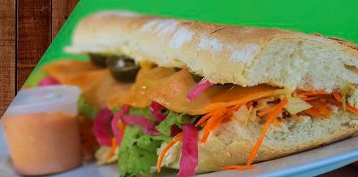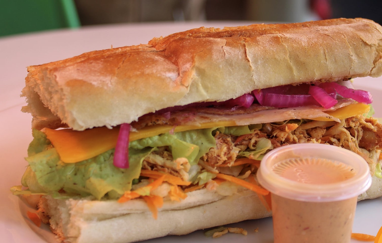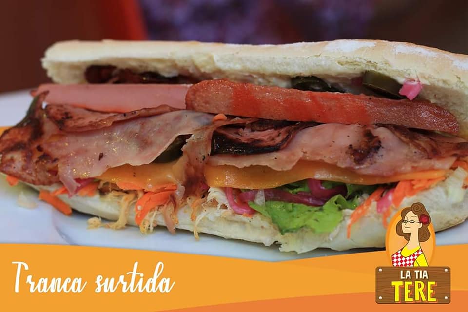 Mayonesa, jamón, salami, tocino, cebolla, chile jalapeño, romanita con zanahoria y lechuga.