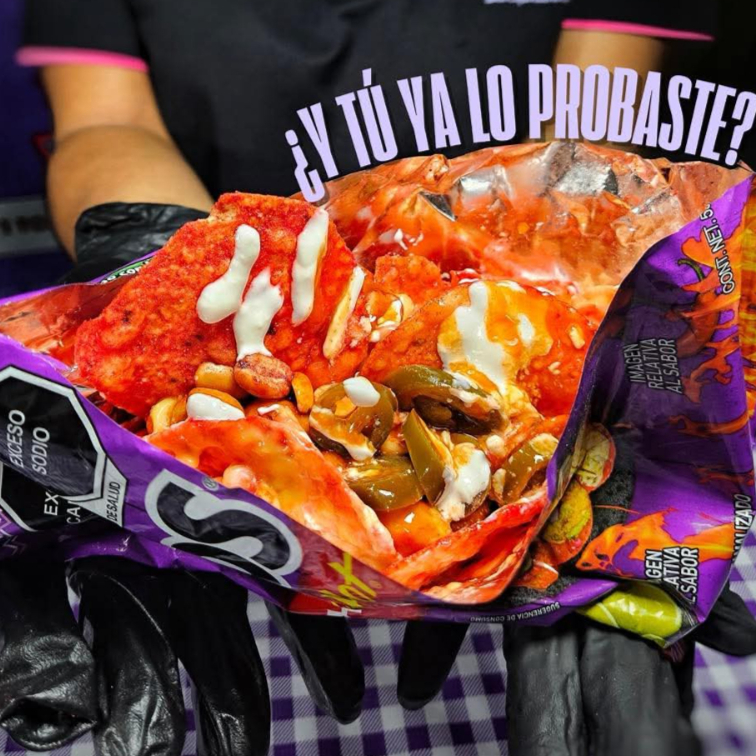 TOSTITOS FLAMIN HOT, CACACUATES SALADOS, GRANOS DE ELOTE, SALSA BOTANERA, MEDIA CREMA, JALAPEÑO Y QUESO PARA NACHOS