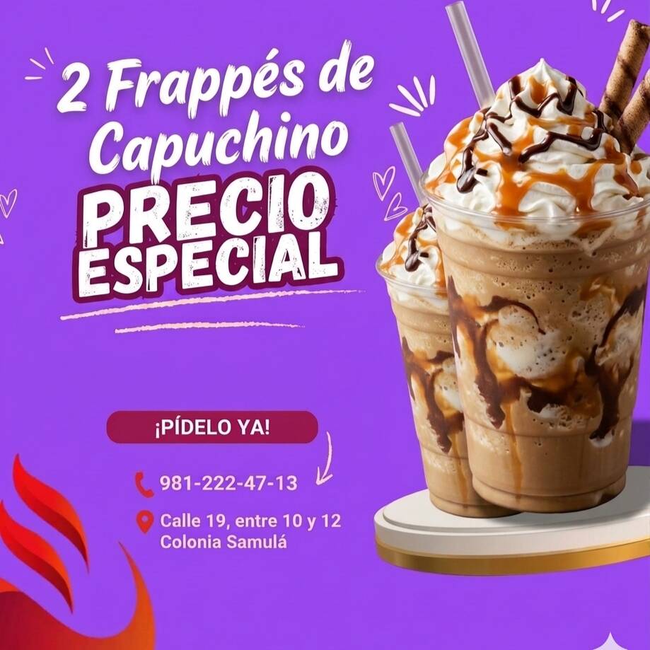 CAFE DE OLLA EN POLVO, LECHE LIQUIDA DESLACTOSADA, LECHE EN POLVO, AZUCAR, CHANTILLY DE VAINILLA, VAINILLA LIQUIDA, CANELA EN POLVO Y HIELO MOLIDO.