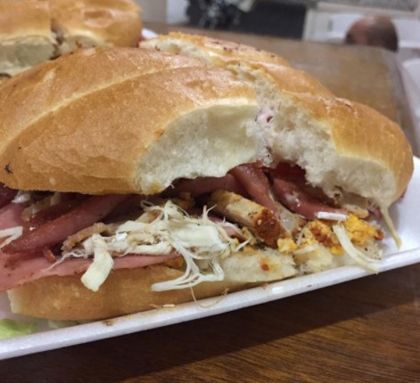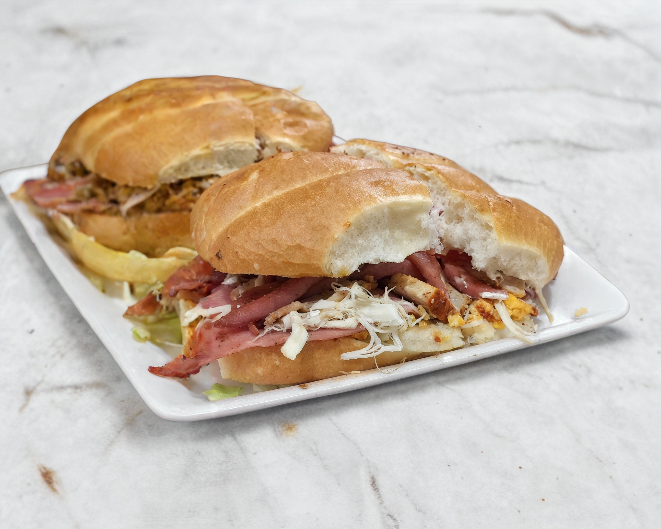 Pan tradicional, carne de la casa, queso americano, 1 jamón, queso manchego, 2 salami, salchicha, 1 tocino, romanita, tómate y cebolla curtida.