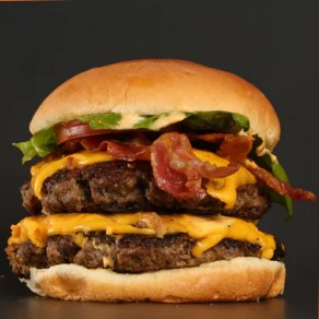 Carne de la casa, queso americano, tocino, romanita, tómate y cebolla curtida.