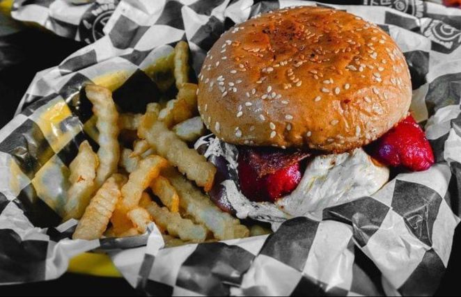Carne de res 100% casera queso Philadelphia, salchicha, tocino, lechuga, cebolla y aderezos. Incluye porción de papas a la francesa.