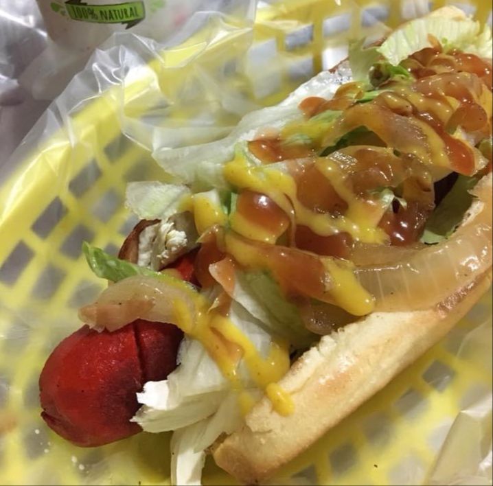 Salchicha jumbo, queso Philadelphia, jamón, lechuga, cebolla y aderezos.