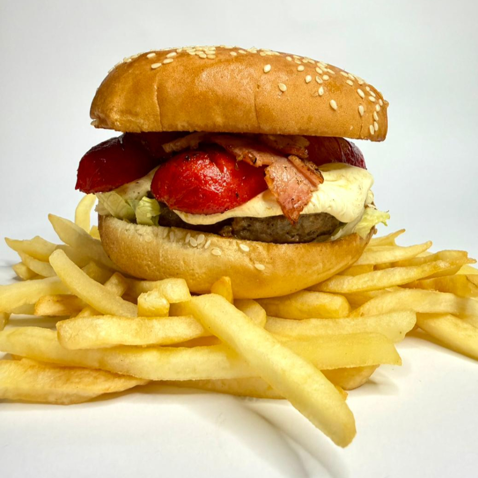 Carne de Res 100% Casera, Queso Americano, Salchicha. Tocino, Lechuga, Cebolla y Aderezos. Incluye una pequeña porción de papas