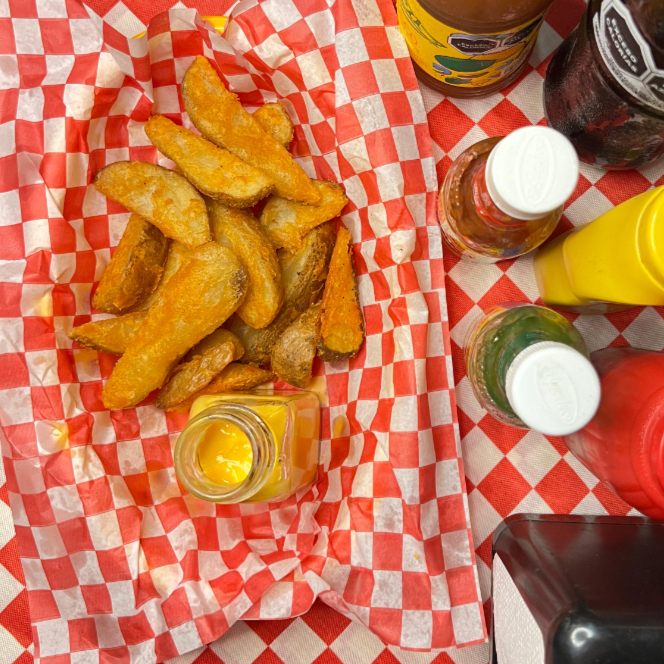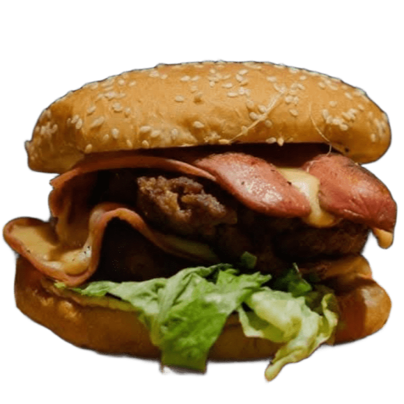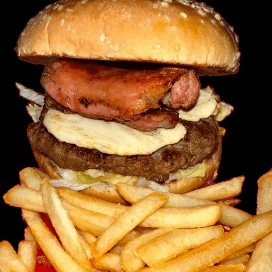 Dos Carne de Res 100% Casera, Dos Queso Americano, Salchicha. Tocino, Lechuga, Cebolla y Aderezos. Incluye una pequeña porción de papas