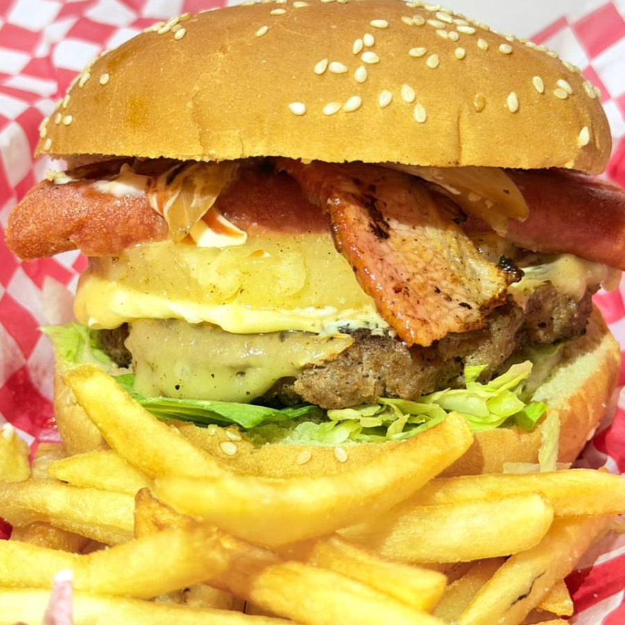 Carne de Res 100% Casera, Queso de Hebra, Piña, Chistorra, Tocino, Lechuga, Cebolla y Aderezos. Incluye una pequeña porción de papas