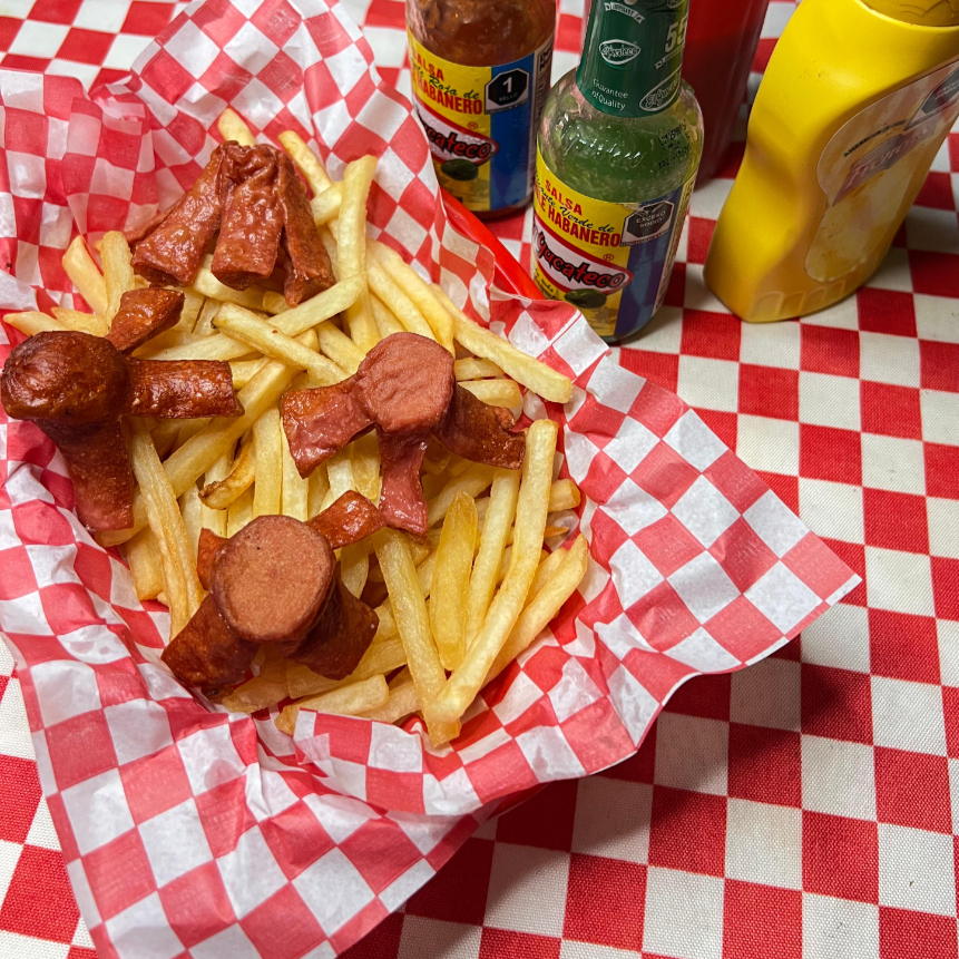 Carne de Res 100% Casera, Chorizo, Queso Manchego, Salchicha. Tocino, Lechuga, Cebolla y Aderezos. Incluye una pequeña porción de papas