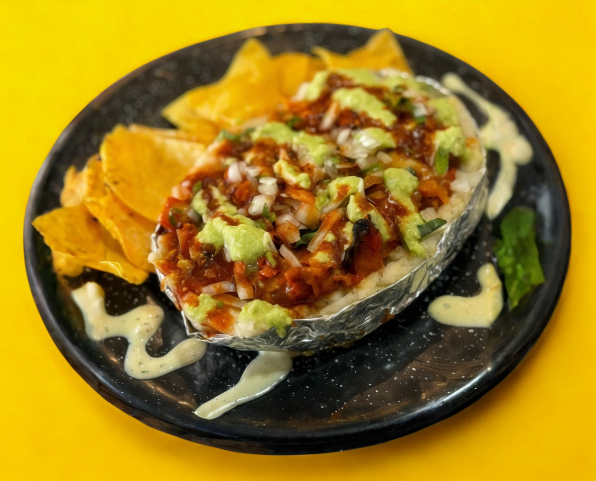 Deliciosa Papa Rellena Mezclada con Quesos, aderezada con Crema de Ajo y Carne a elección, Acompañala con Salsa Macha