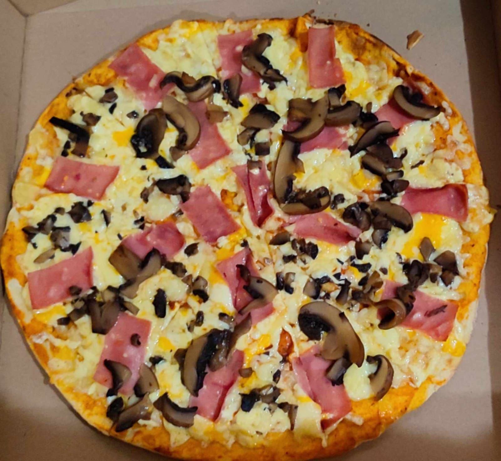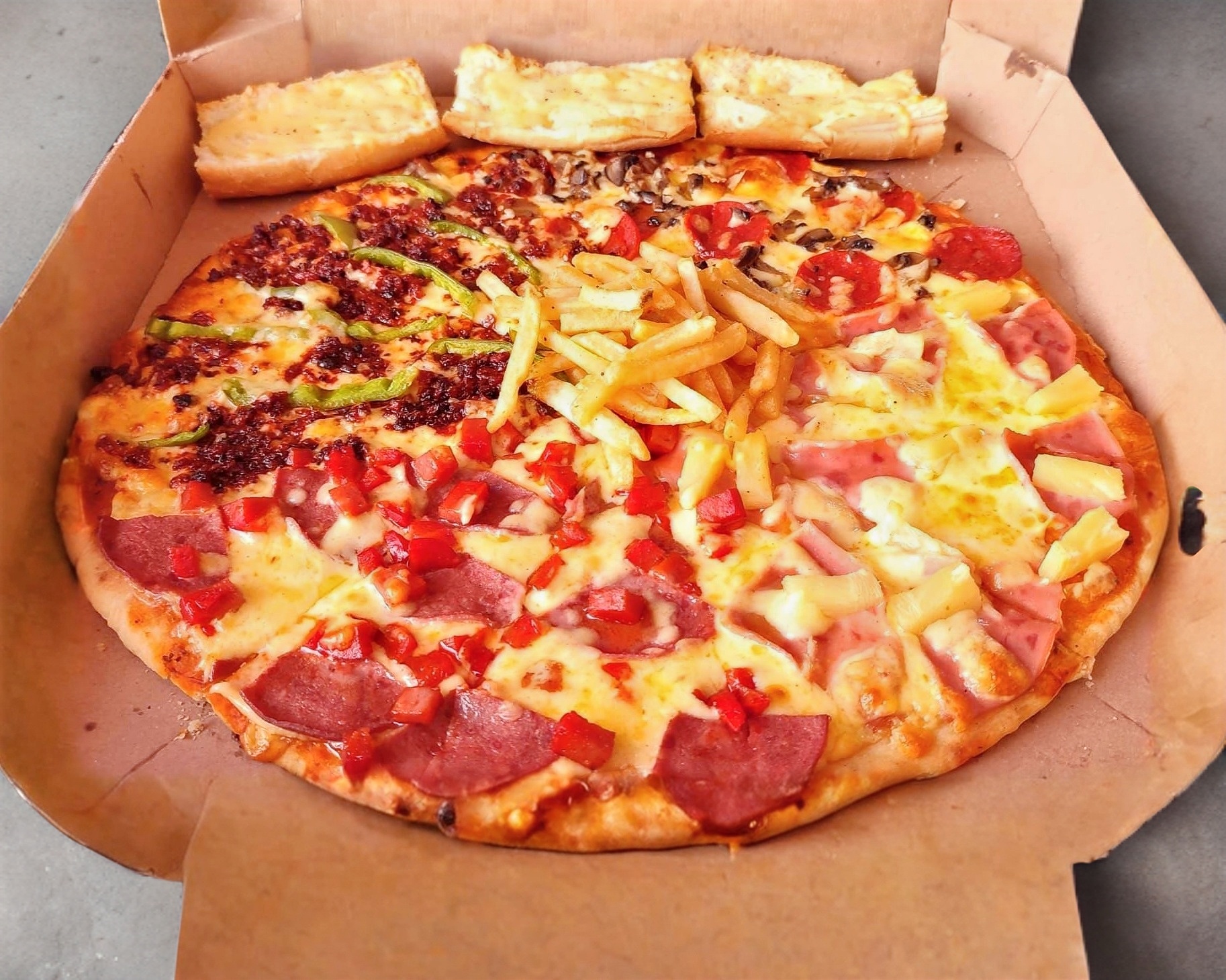 Ingredientes: una capa de queso, pepperoni, champiñones, hawaiana, chorizo, pimiento, salchicha con salami. Incluye papas y pan al ajo.