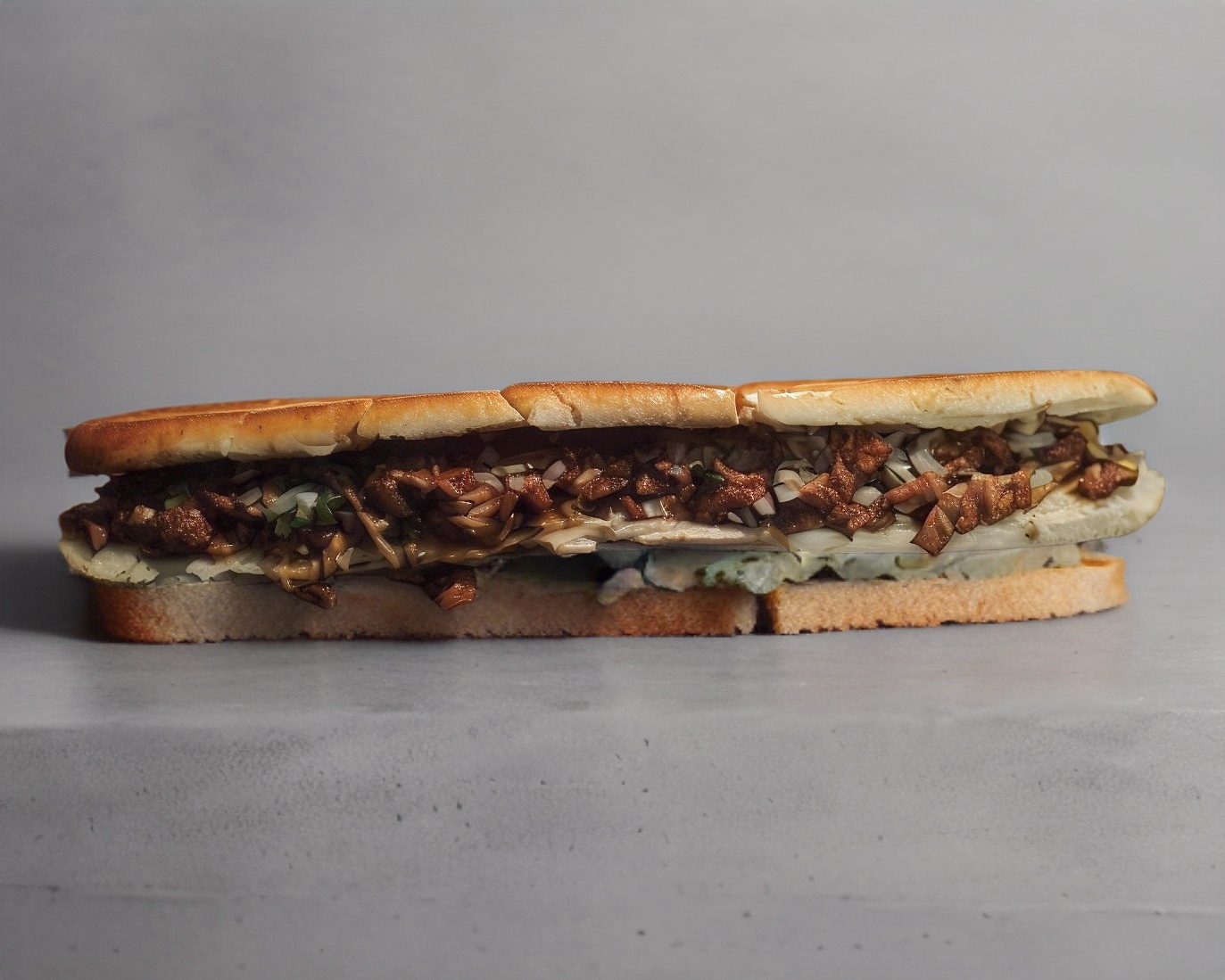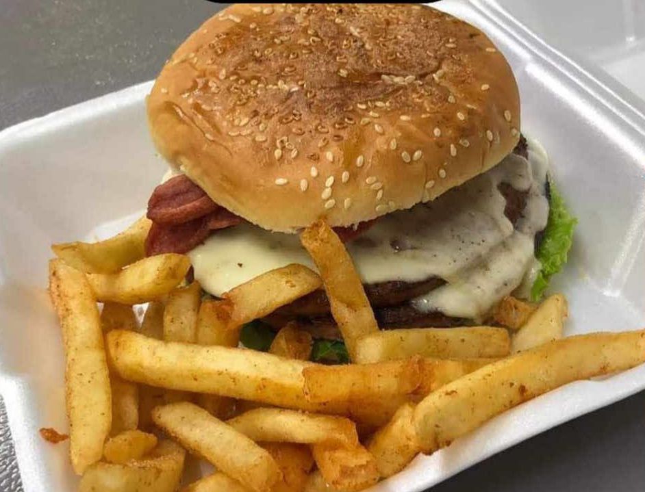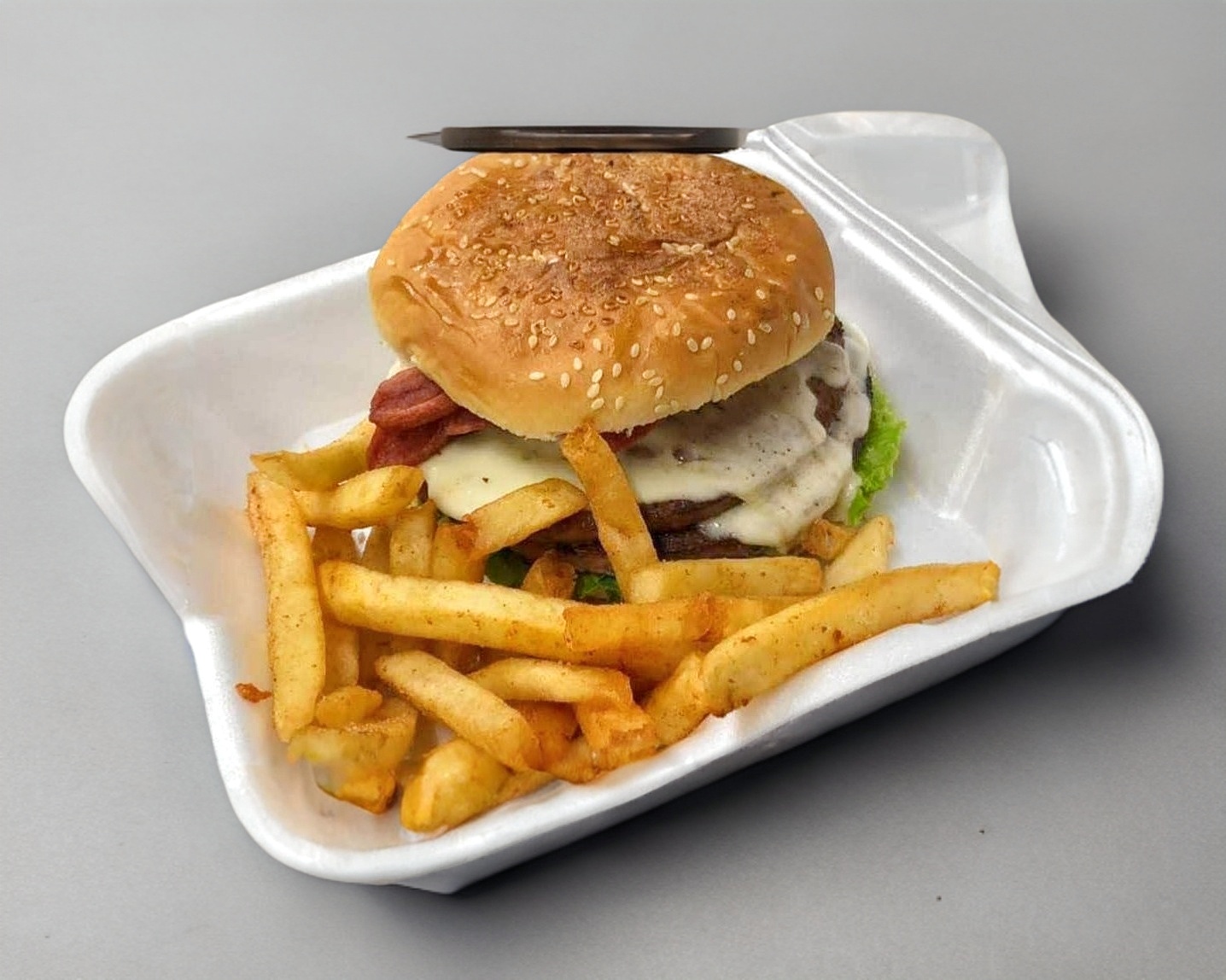 Pan brioche con 250 g de carne de sirloin, salchichas gratinadas en queso gouda, lechuga, tomate y papas a la francesa.