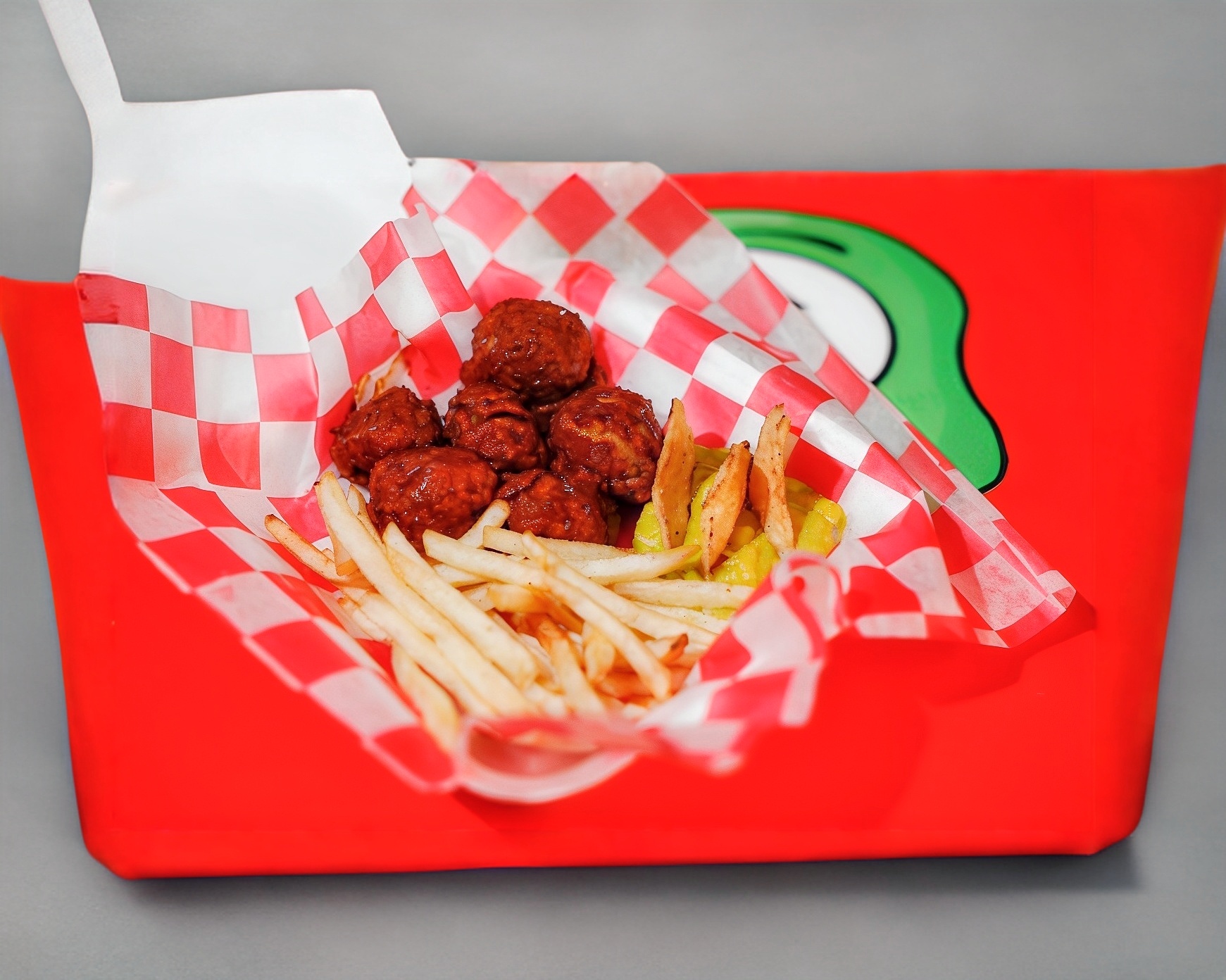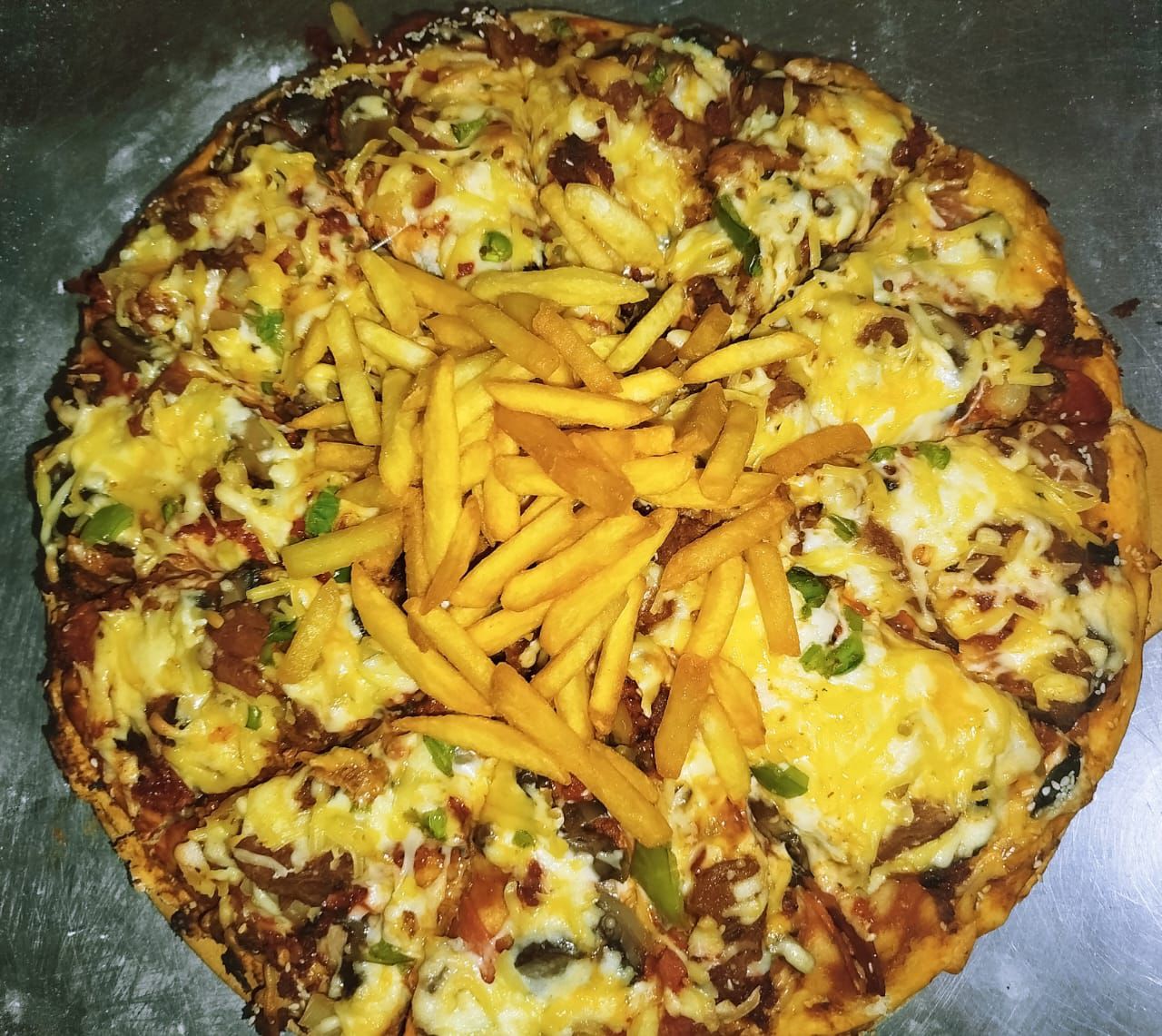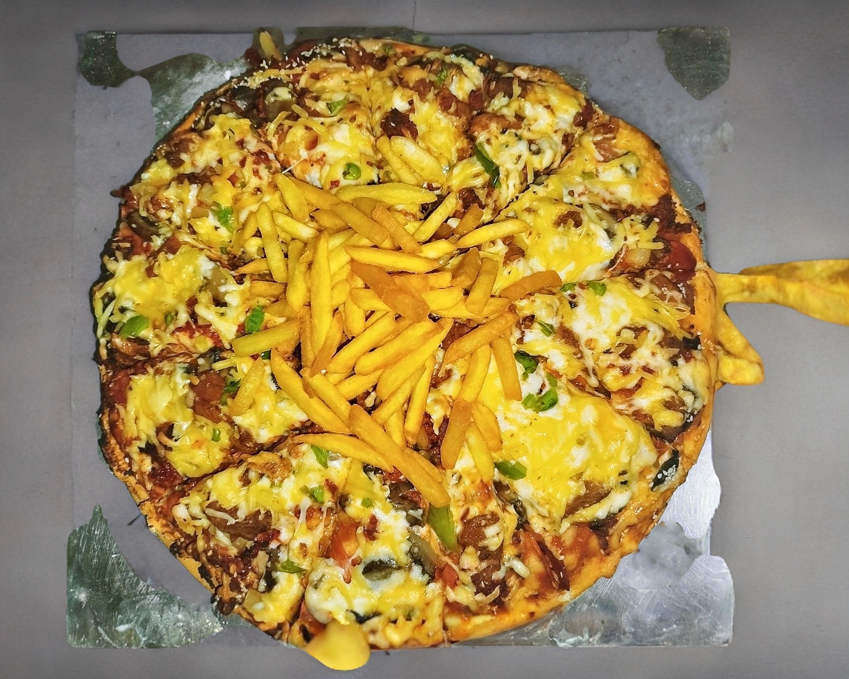Pizza grande de doble capa rellena de salchicha asada, salchicha de pavo, carne de sirloin, cubierta de chorizo, champiñones, pimiento, pepperoni, carne al pastor, una capa de queso y acompañada de papas a la francesa.