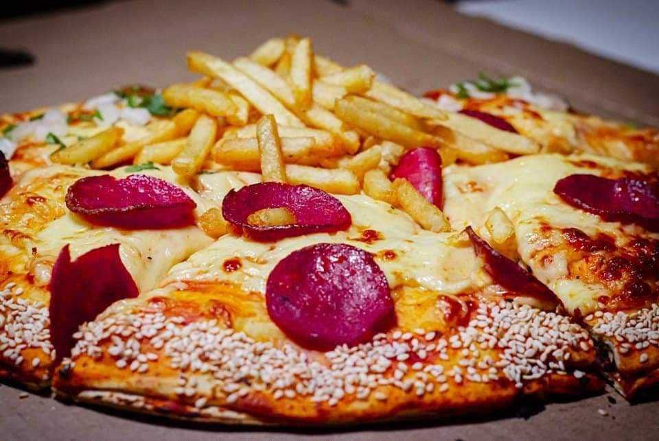 Pizza de doble capa de queso rellena de carne de hamburguesa, salchicha de pavo, salchicha de asar acompañada de pepperoni y papas a la francesa.