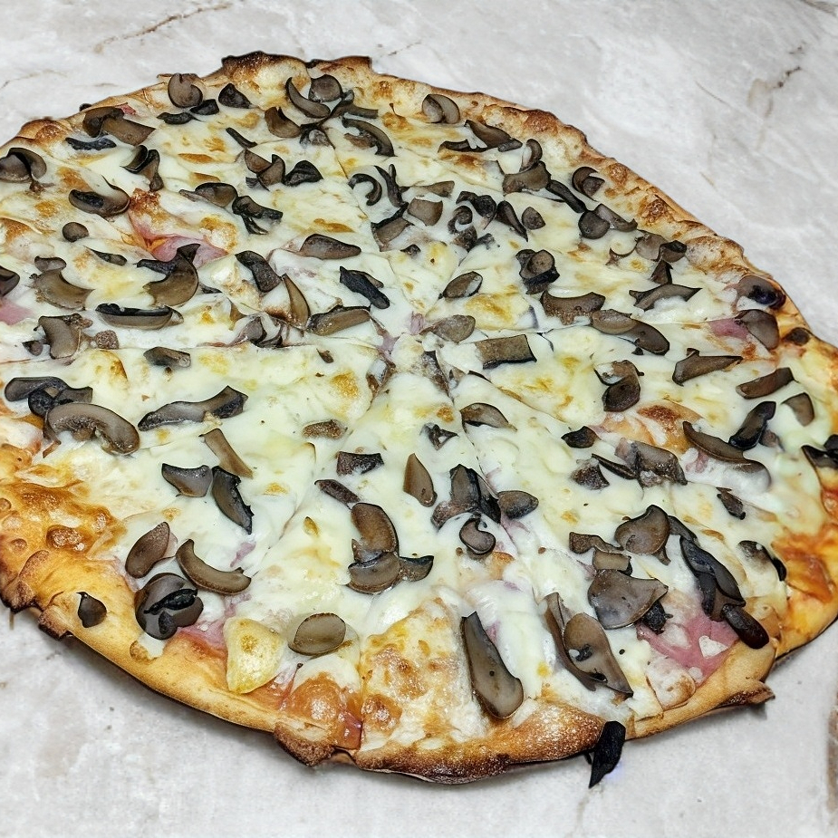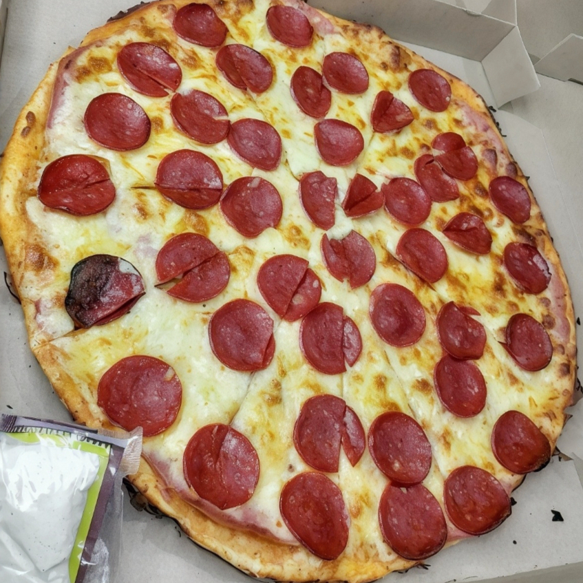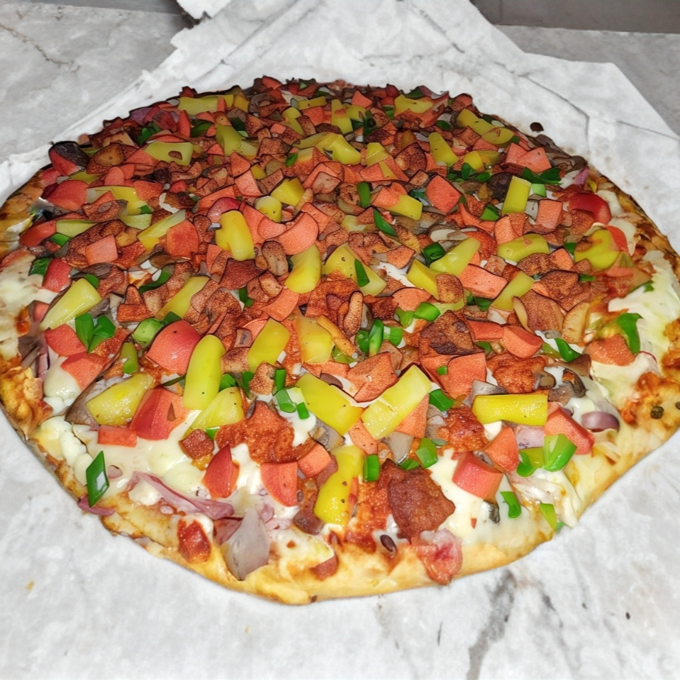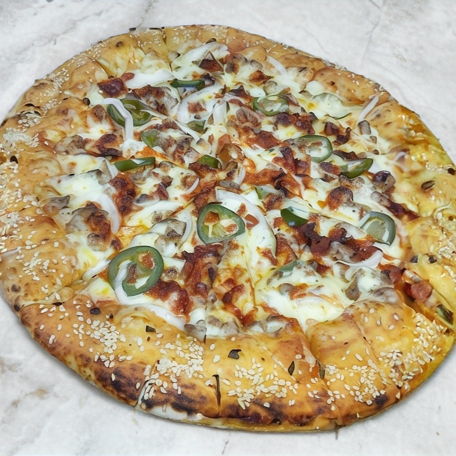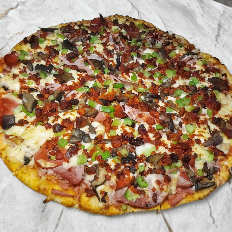 Pizza con jamón, salchicha, salami, tocino, pepperoni, chorizo, champiñón, pimiento y queso.