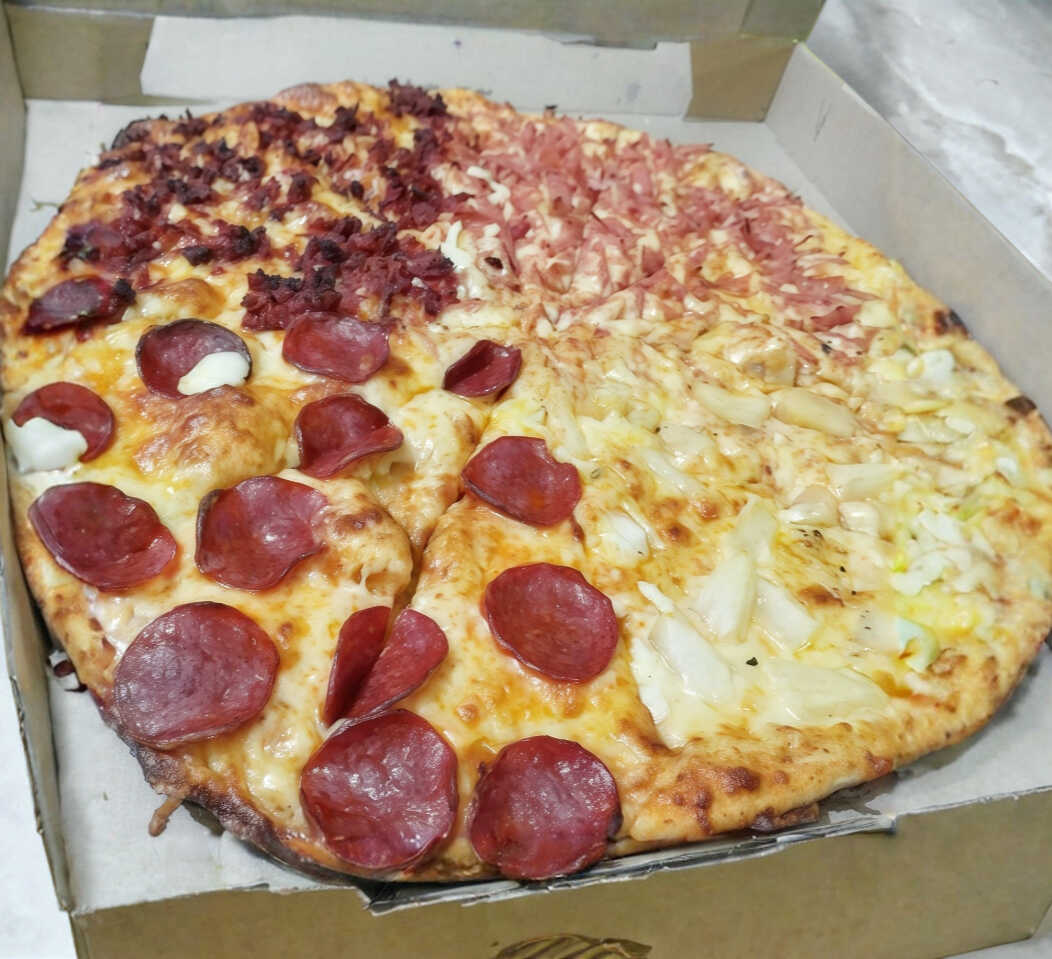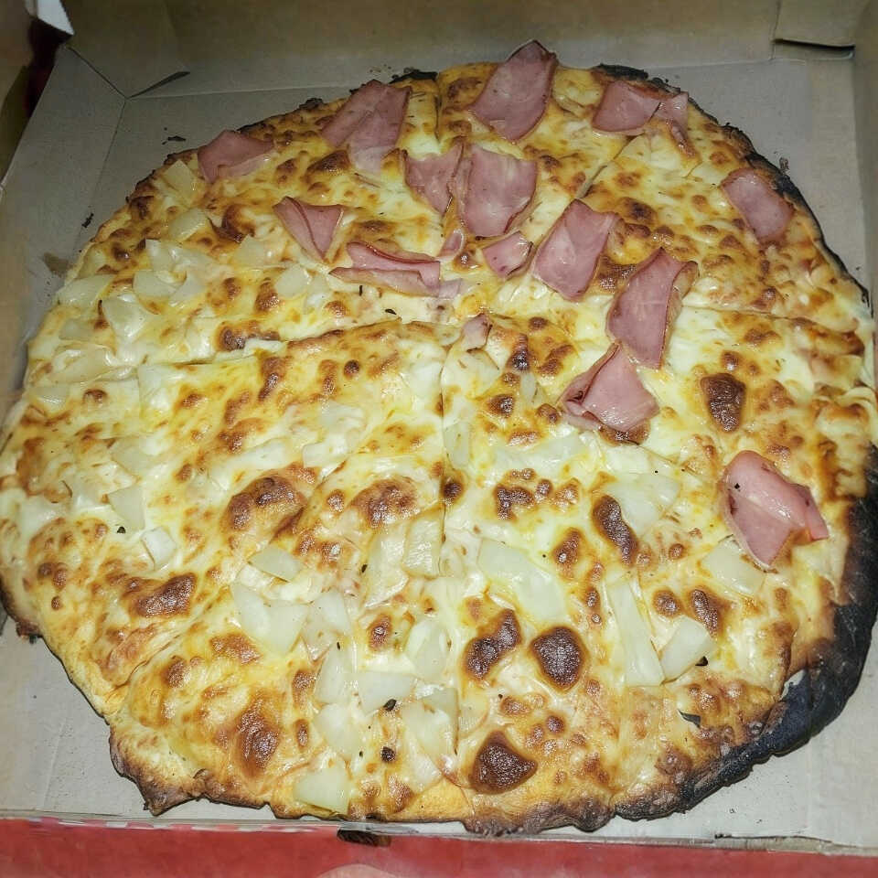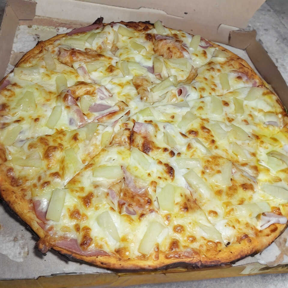 Pizza de 4 ingredientes: Piña, salchicha, pepperoni y chorizo.