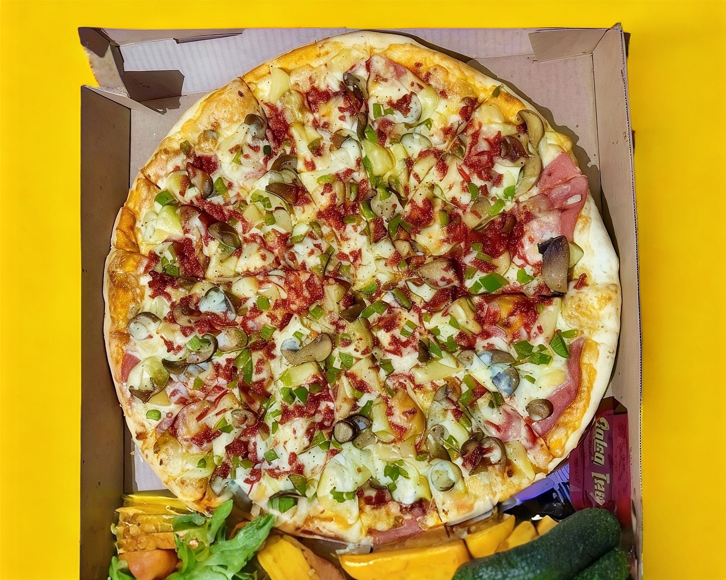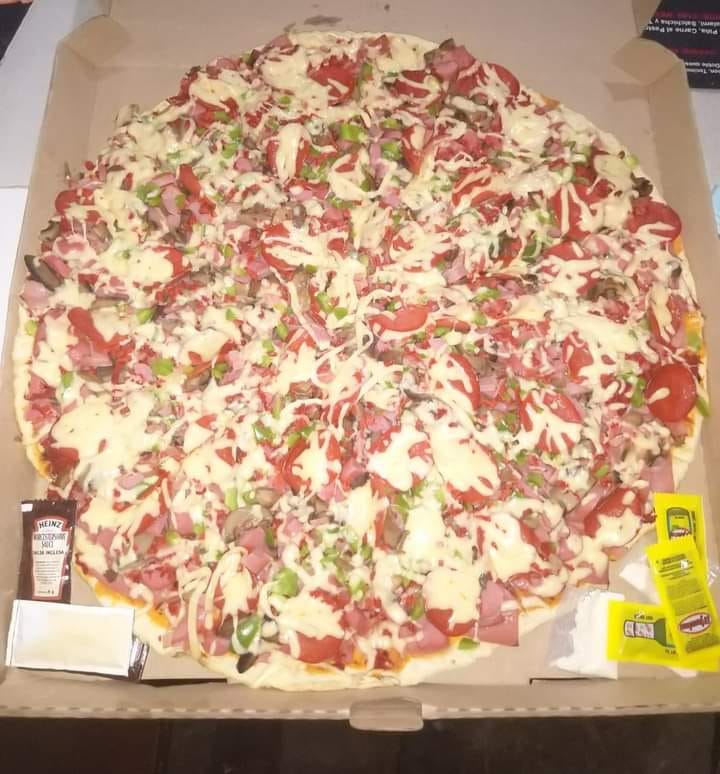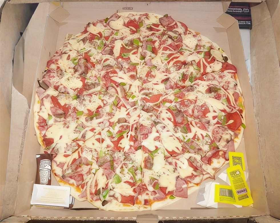 Jamón, salchicha, champiñón, tocino, salami, piña, pepperoni y pimiento