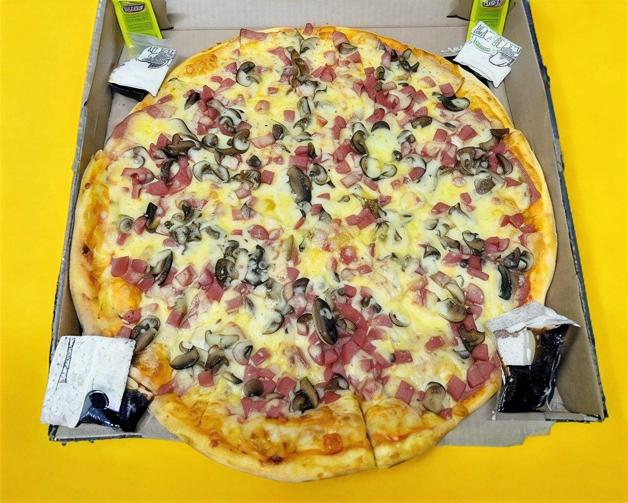 Jamón, salchicha, champiñón, pepperoni, pimiento y extra queso