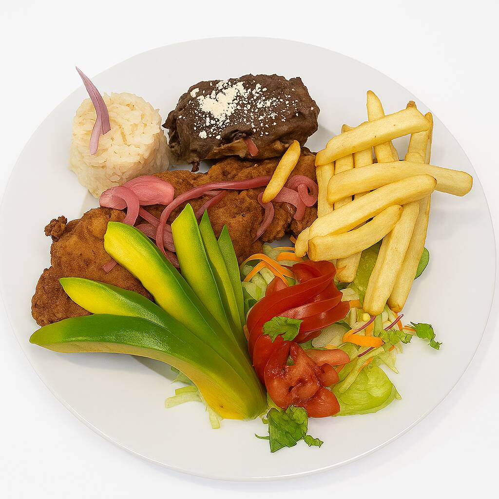 Empanizada con coco y nuestra harina saborizada acompañada de frijol, papas arroz crema de elote