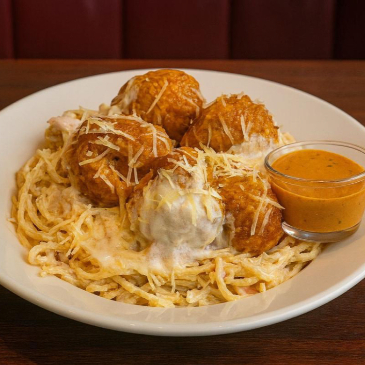 Pasta con crema alfredo con boneless para los amantes de este plato