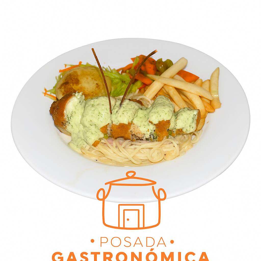 Pechuga rellena de champiñon y queso acompañada de pasta, papas, ensalada fresca