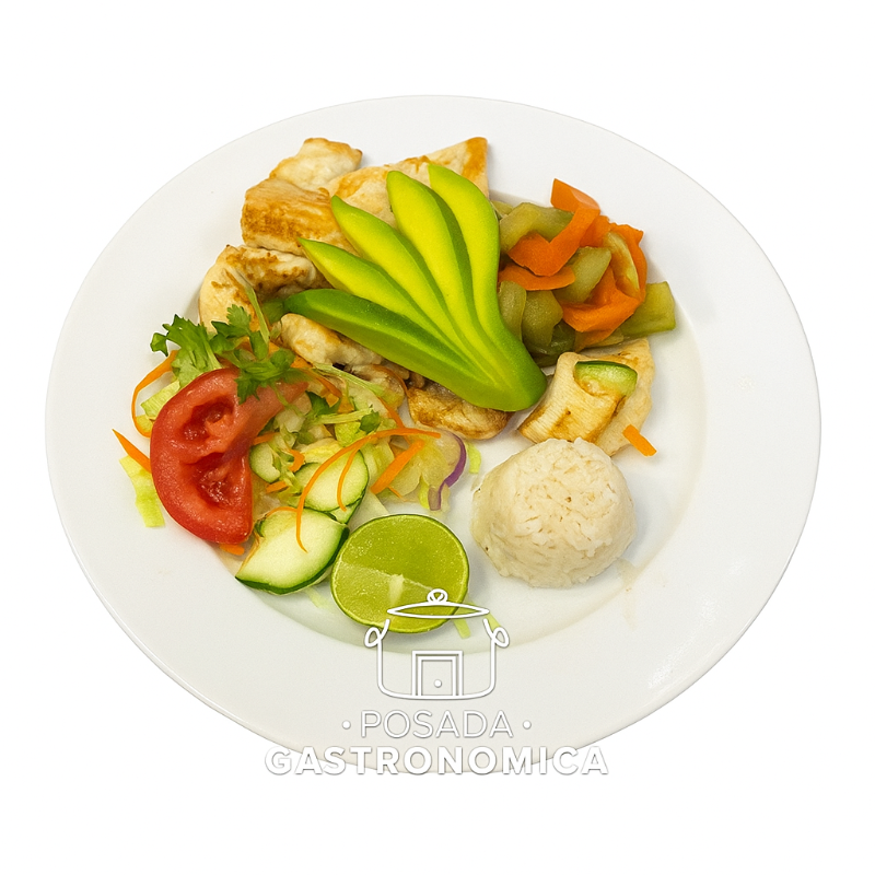 Pechuga a la plancha, verduras al vapor y salteadas, ensalada fresca, aguacate y arroz