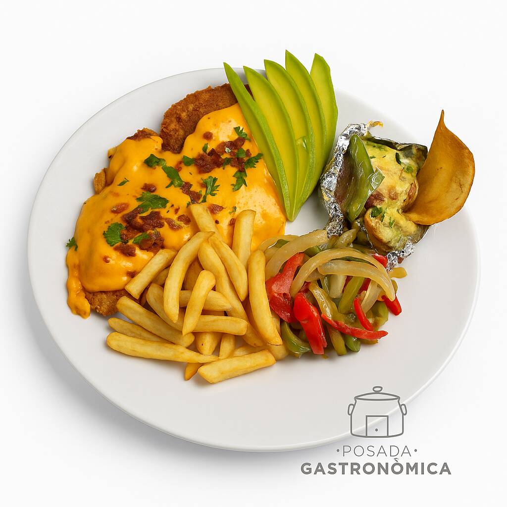 Milanesa con salsa con deliciosa salsa de queso incluye papas frijol