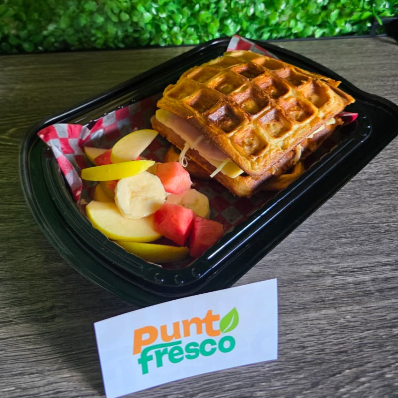 Waffle con Pollo, Queso, Lechuga, Zanahoria, Tomate, Pepino y Aguacate acompañado de Fruta