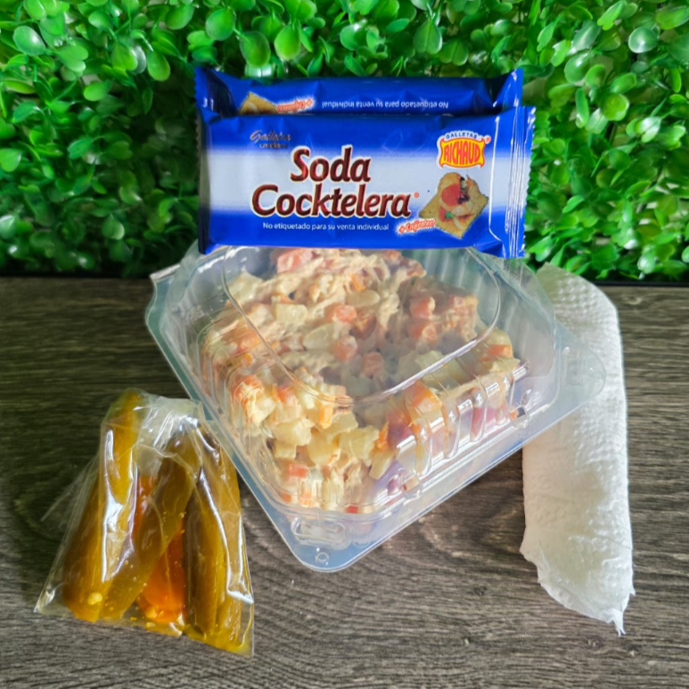300 gramos de ensalada de pollo, verduras, galletas y chile jalapeño.
