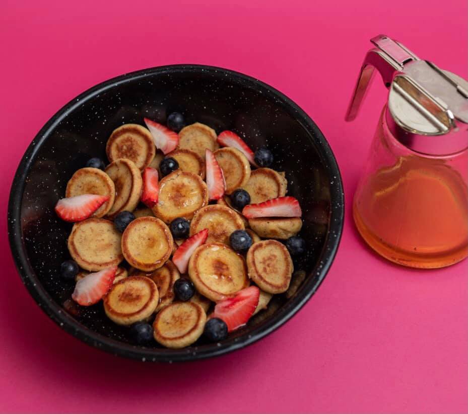 Mini hot cakes integrales acompañados de frutos rojos y miel.