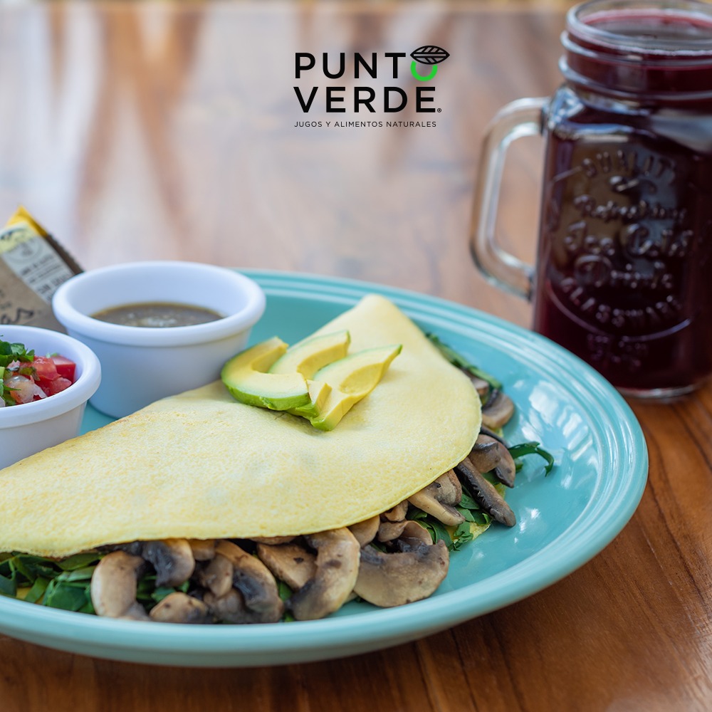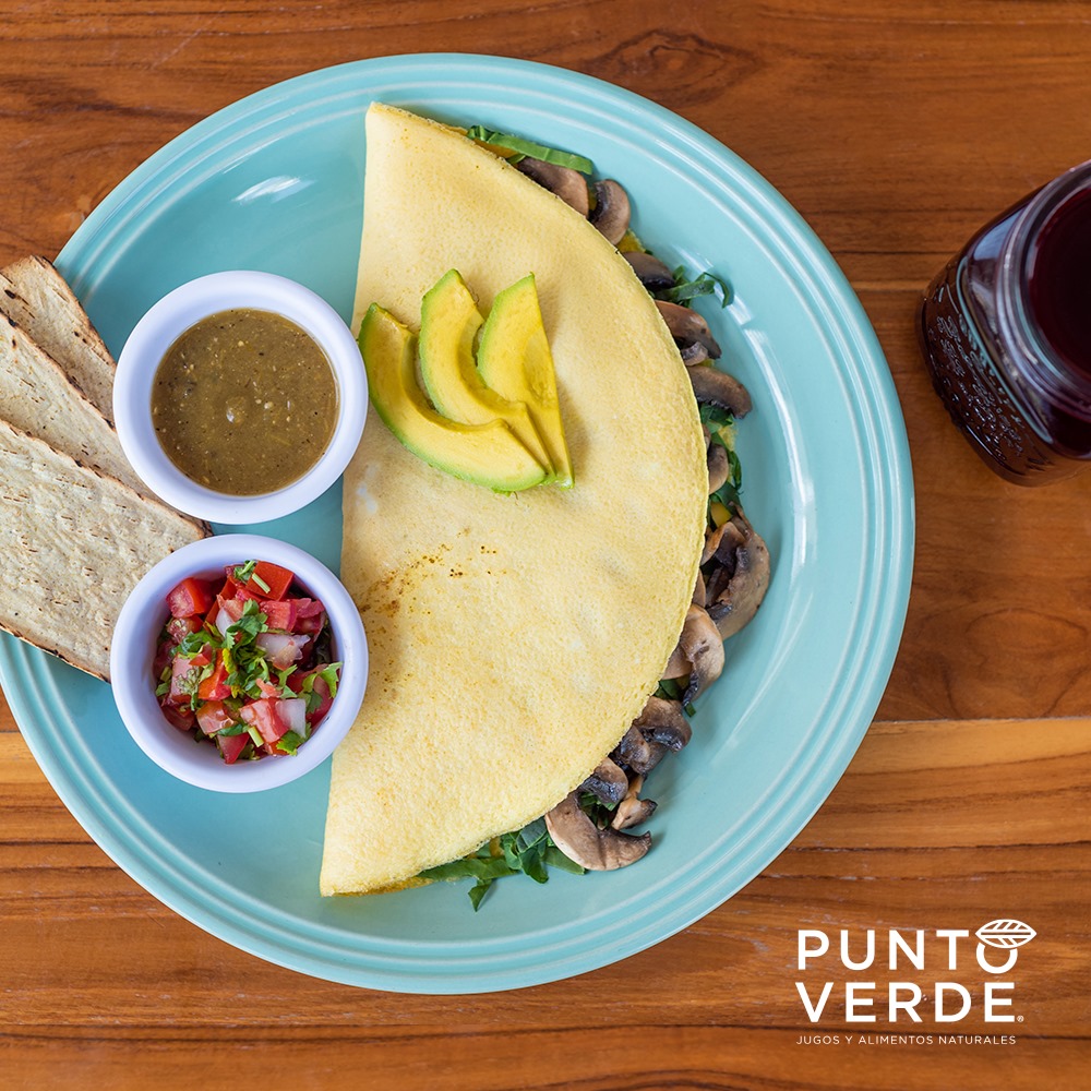 Porción de huevos enteros, acompañado de pimiento, espinaca, champiñón, aguacate y salsa pico de gallo.