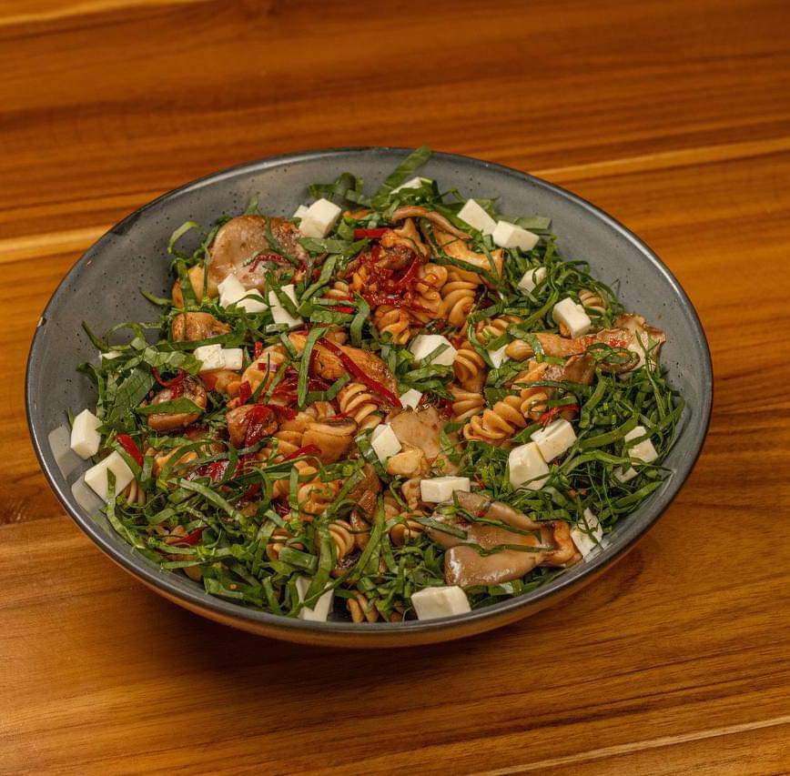 Ensalada tibia de pasta fusilli integral, espinaca, panela, cacahuates y hongos al ajillo estilo tai.