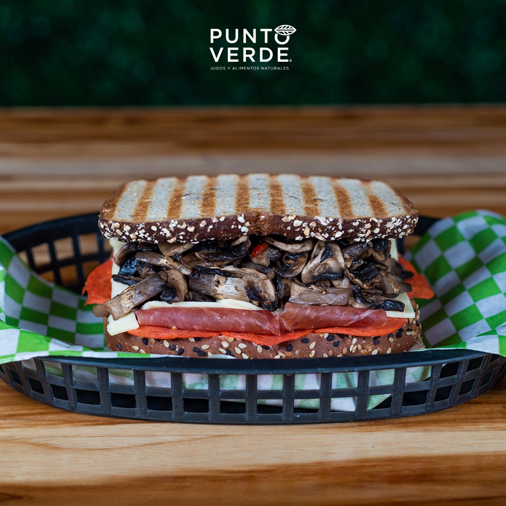 Sándwich multigrano con pepperoni, champiñones naturales a la parrilla, con jamón serrano, queso manchego ya aderezo especiado de tomate.