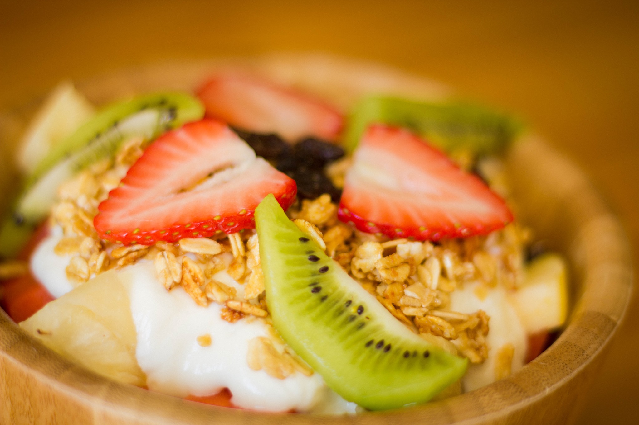 Combinación de plátano, papaya, melón, piña y manzana. Acompañado de yogurt griego, miel y granola.