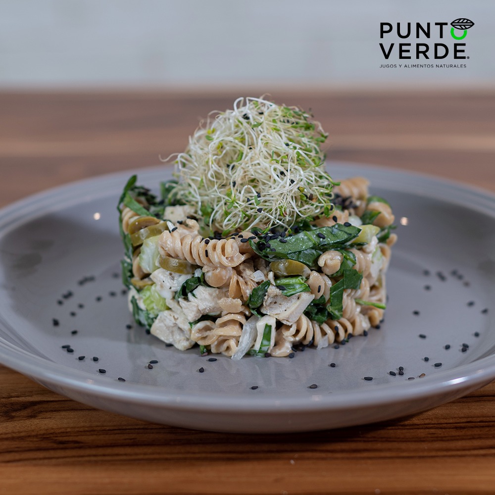 Pasta fusilli integral combinada con pollo, espinaca, apio, cebolla, aceituna verde, porción de germinado, lluvia de ajonjolí negro y mayonesa de olivo.