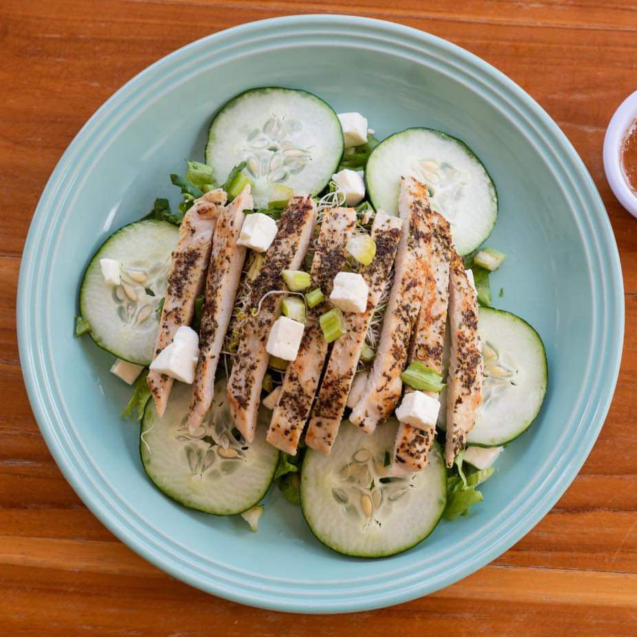 Lechuga italiana, espinacas, pepino, apio, germinado, dedos de panela y pechuga de pollo.